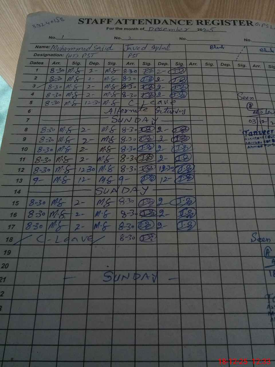 | CNIC | Full Name | Designation | R/C | Absence During Last Calender Month |