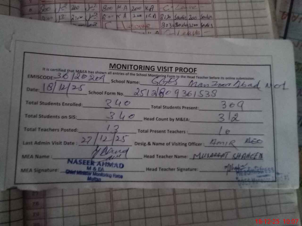 | Monitoring Date: 18-12-2025 | Start Time: 18-12-2025 09:36 AM | End Time: 18-12-2025 10:07 AM | Name of MEA: Gh**** Mu**** | |
