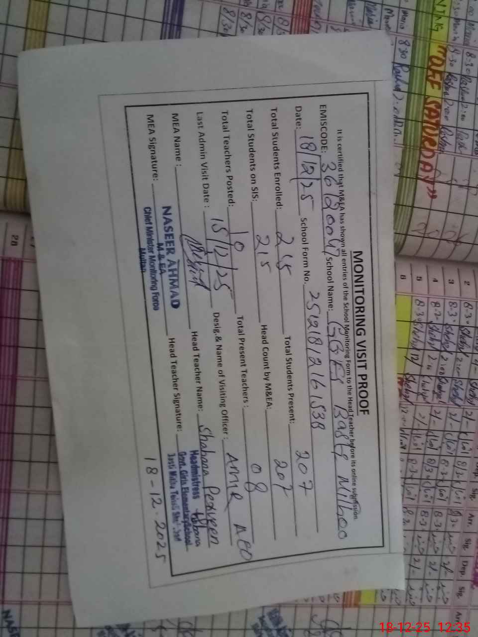 | Attendance Register | Head Teacher | MEA with School | Visit Proof |