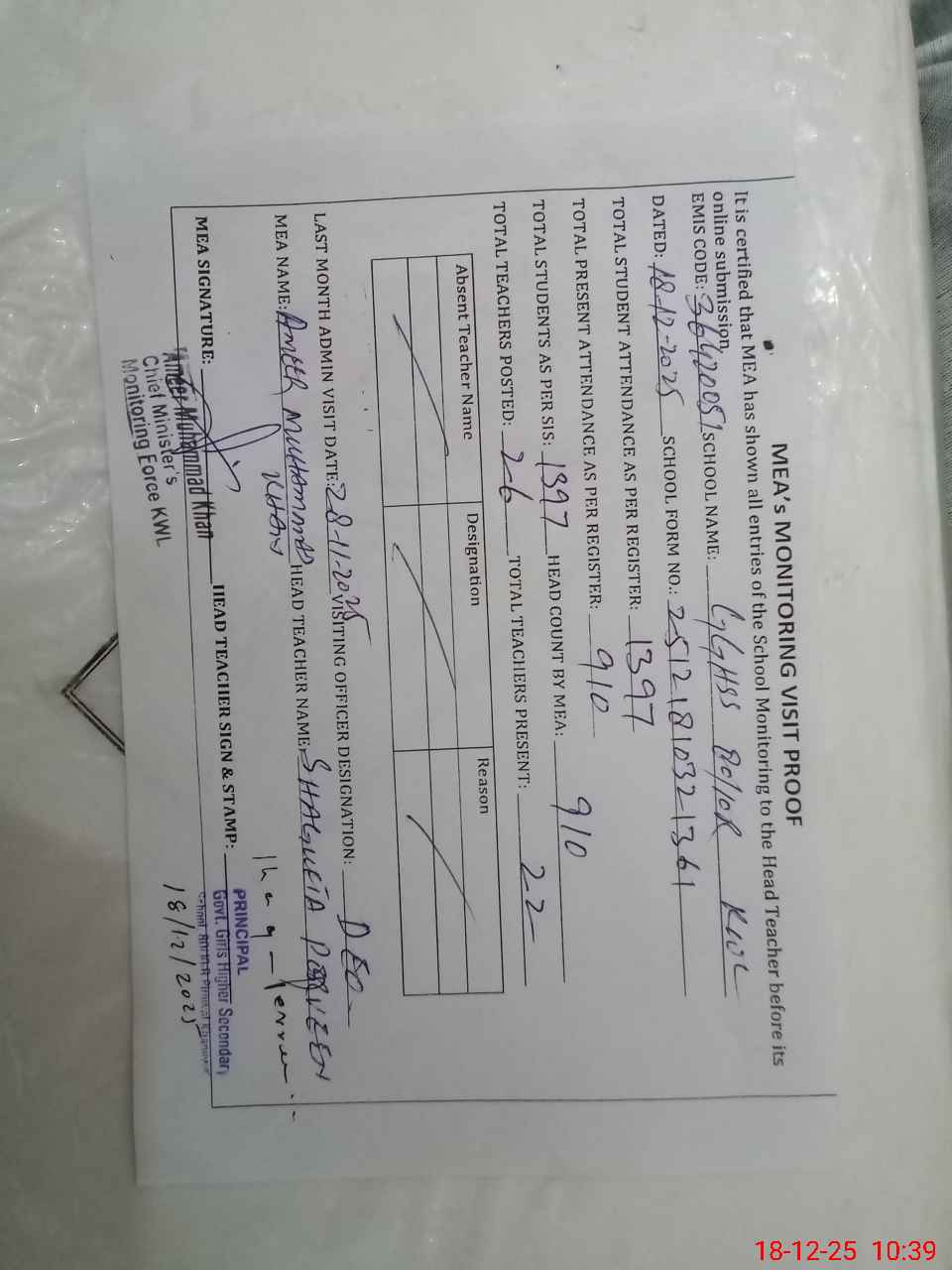 | Monitoring Date: 18-12-2025 | Start Time: 18-12-2025 09:49 AM | End Time: 18-12-2025 10:43 AM | Name of MEA: Am**** Mu**** Kh**** | |