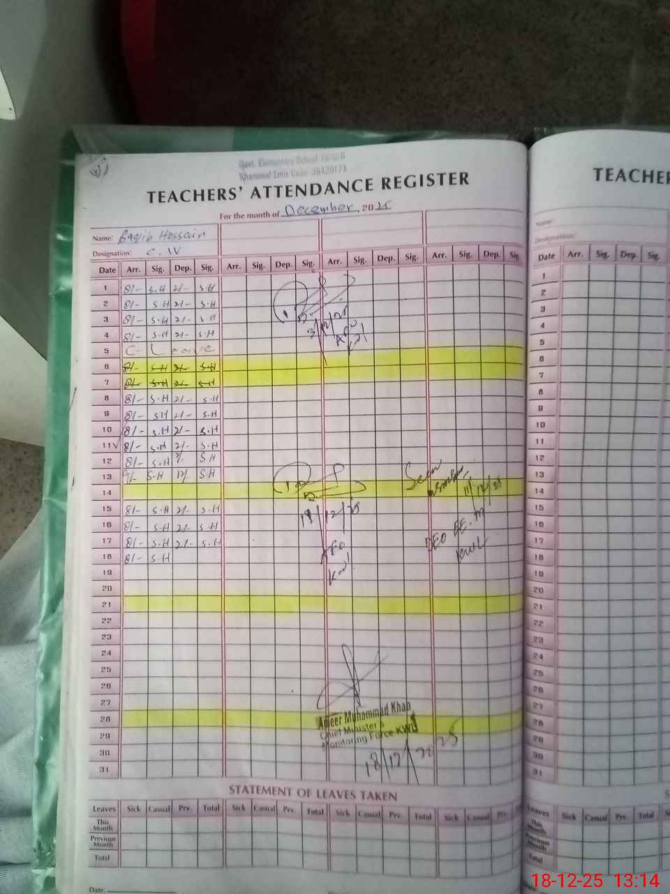 | Remarks (Use Separate Page if Required): on students attandece list in six class two students removed recently in month of December from school | |||||
