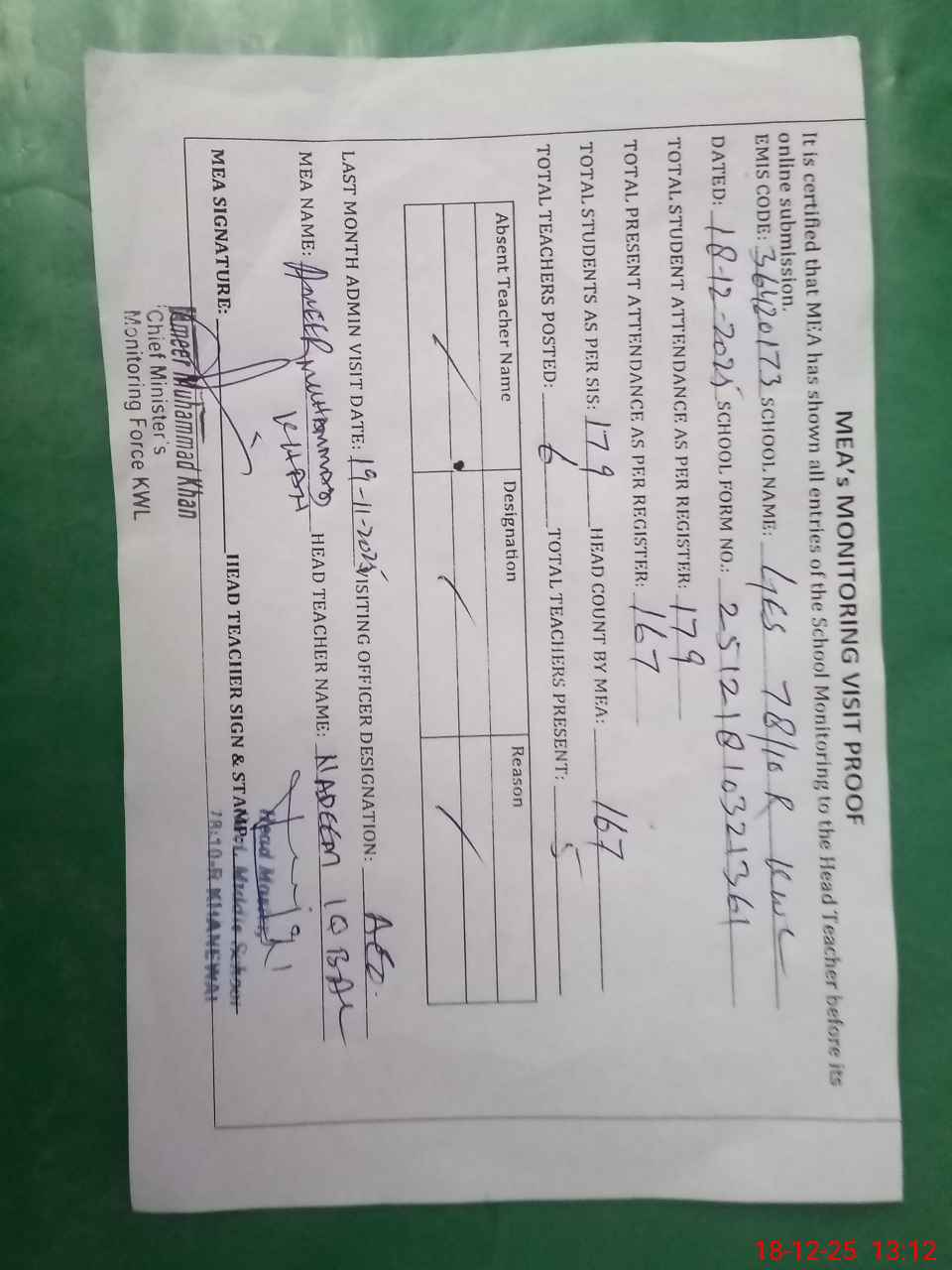 | Attendance Register | Head Teacher | MEA with School | Visit Proof |