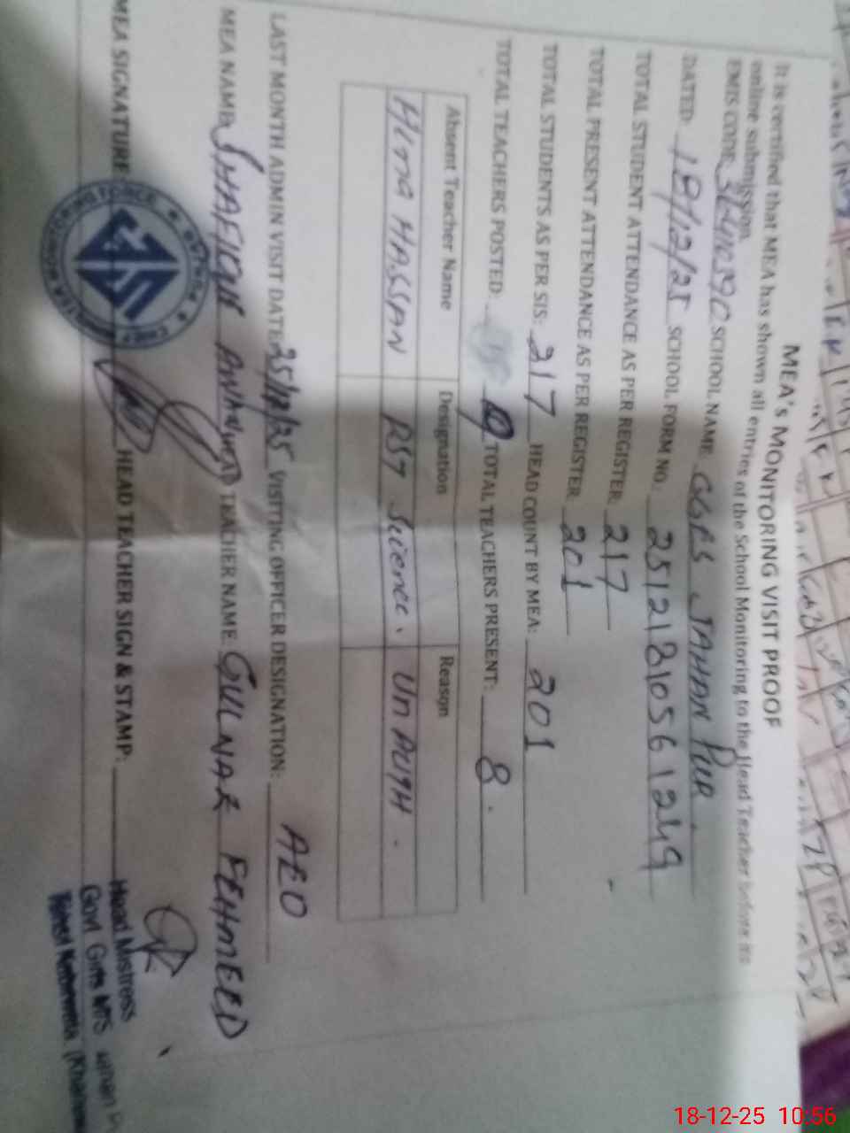 | EMIS Code: 36410390 | Name of School: GGES JAHAN PUR MAKHDOOM PUR, KABIRWALA | |||