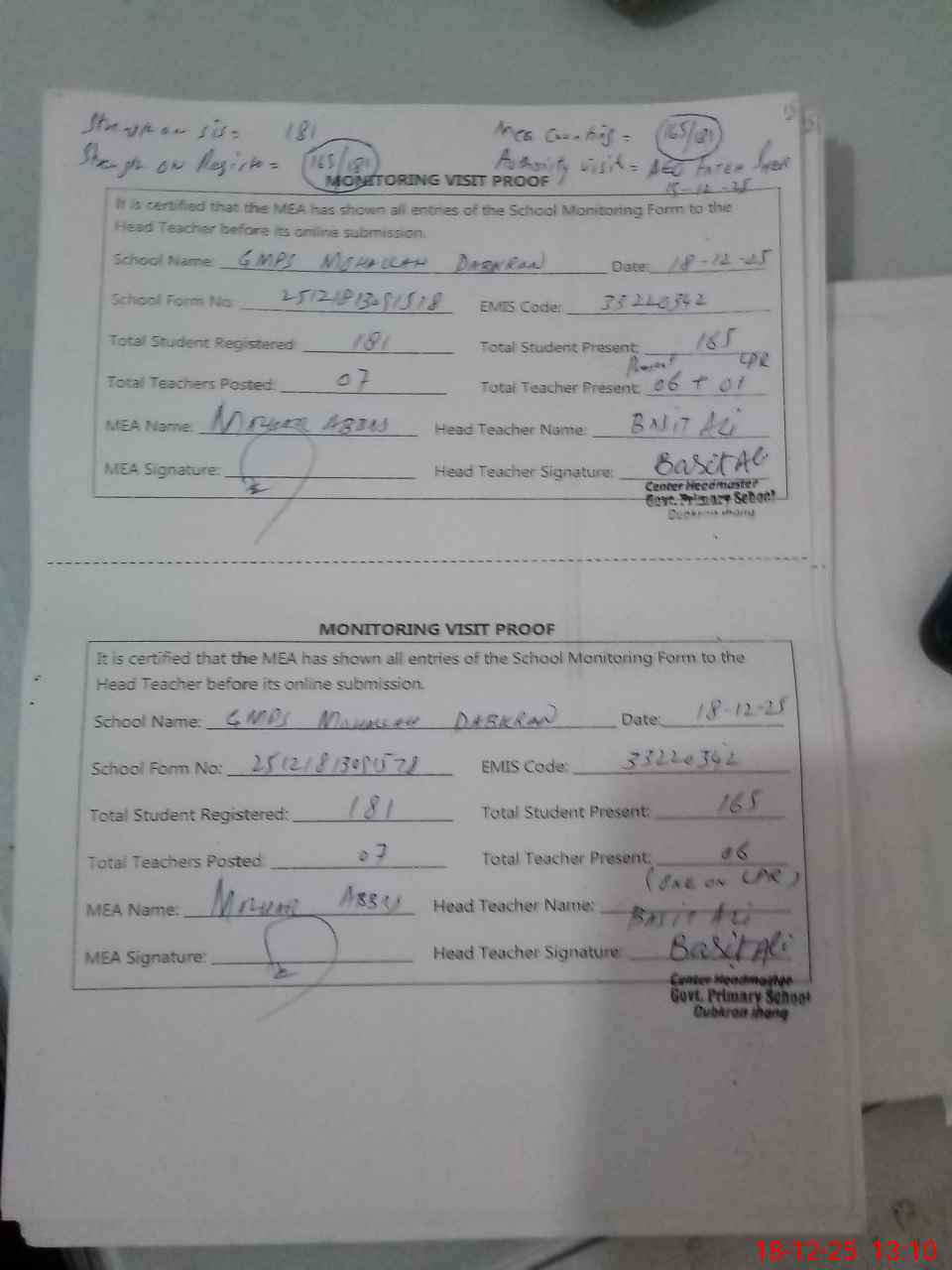 | Attendance Register | Head Teacher | MEA with School | Visit Proof |