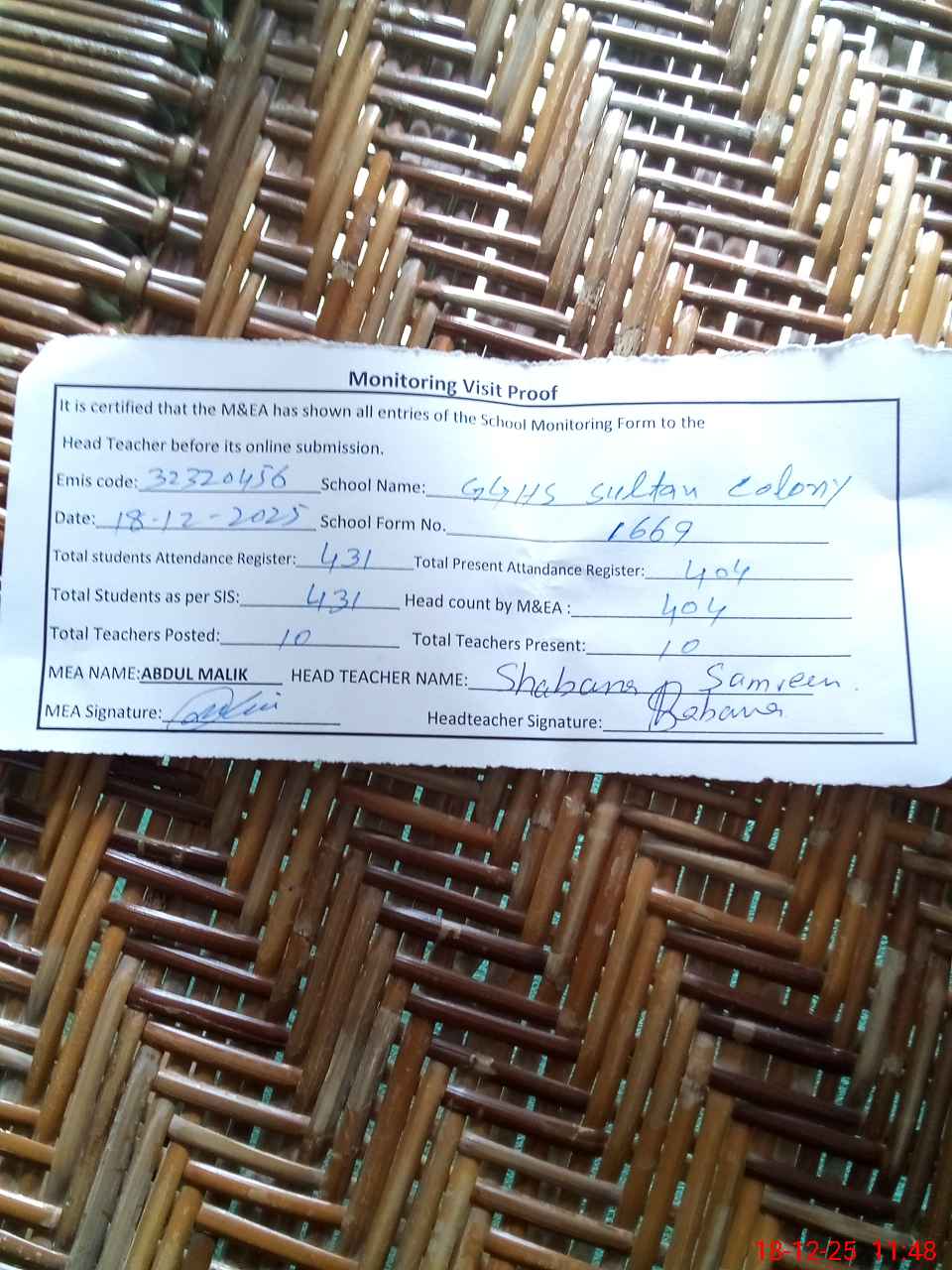 | EMIS Code: 32320456 | Name of School: GGHS SULTAN COLONY | |||