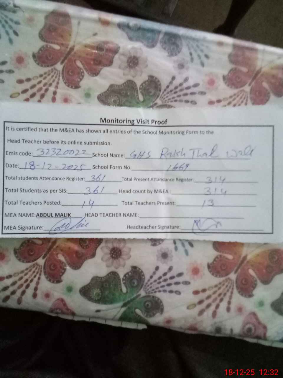 | Attendance Register | Head Teacher | MEA with School | Visit Proof |