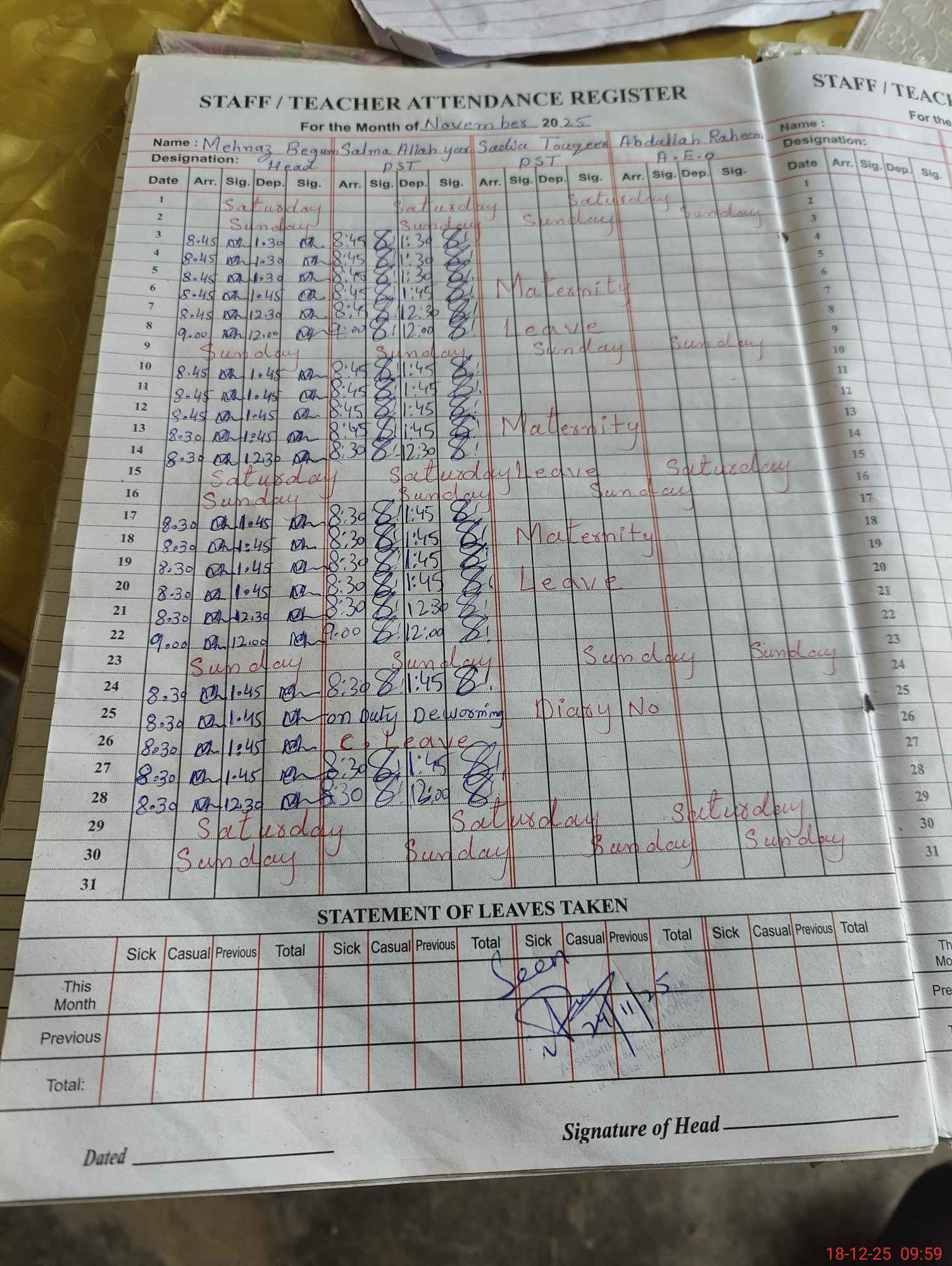 | 37**** | Sa**** Ta**** | PST Science/Maths | Regular | 0 | 0 | 0 | 0 | 0 | 0 | 0 | 0 | 0 | Maternity |