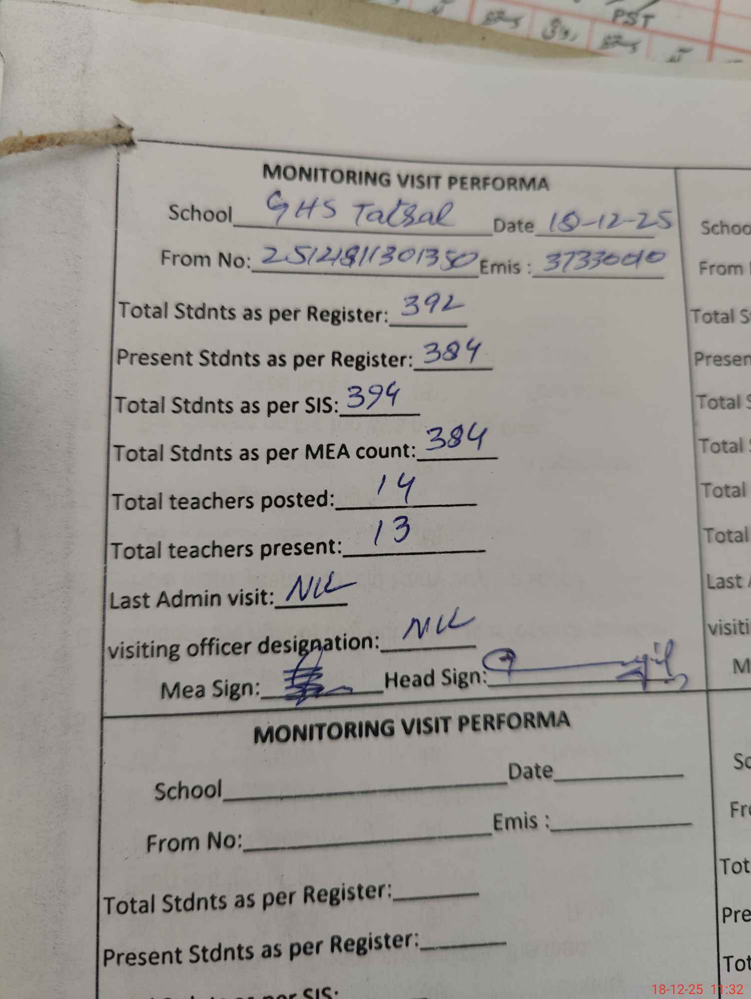 | Attendance Register | Head Teacher | MEA with School | Visit Proof |
