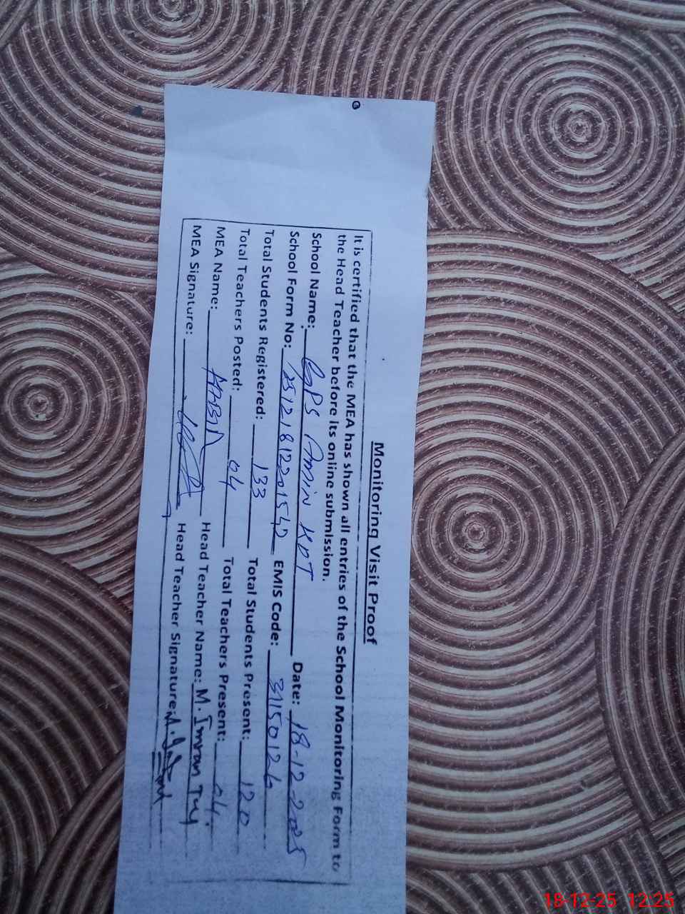 | Attendance Register | Head Teacher | MEA with School | Visit Proof |