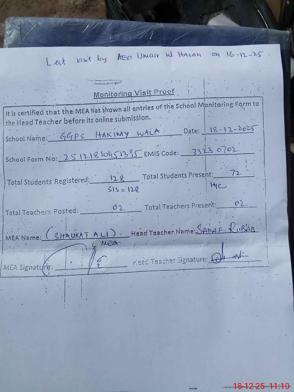 | Attendance Register | Head Teacher | MEA with School | Visit Proof |