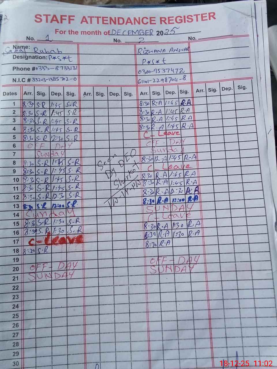 | CNIC | Full Name | Designation | R/C | Absence during last cal. month |
