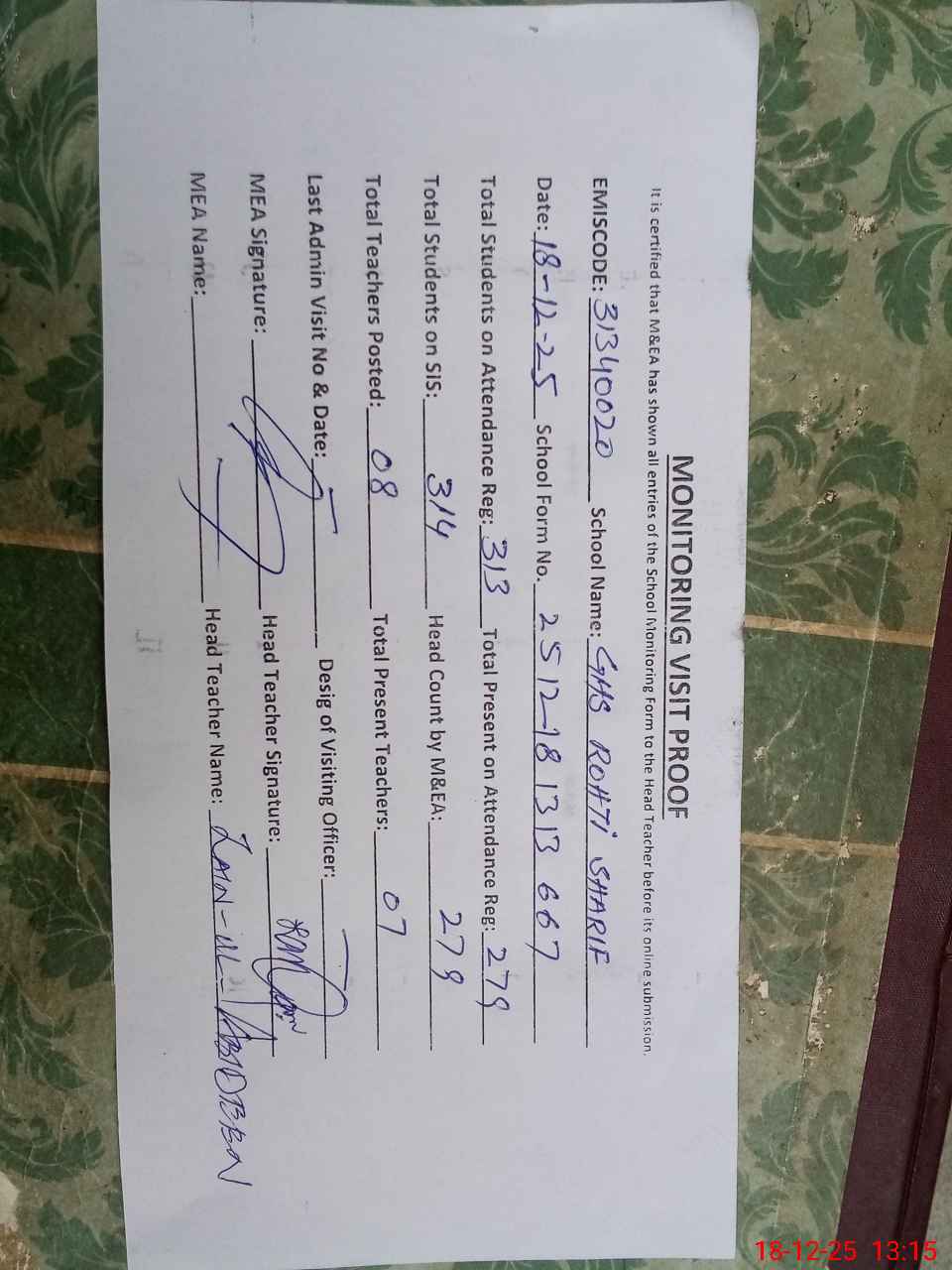 | Attendance Register | Head Teacher | MEA with School | Visit Proof |
