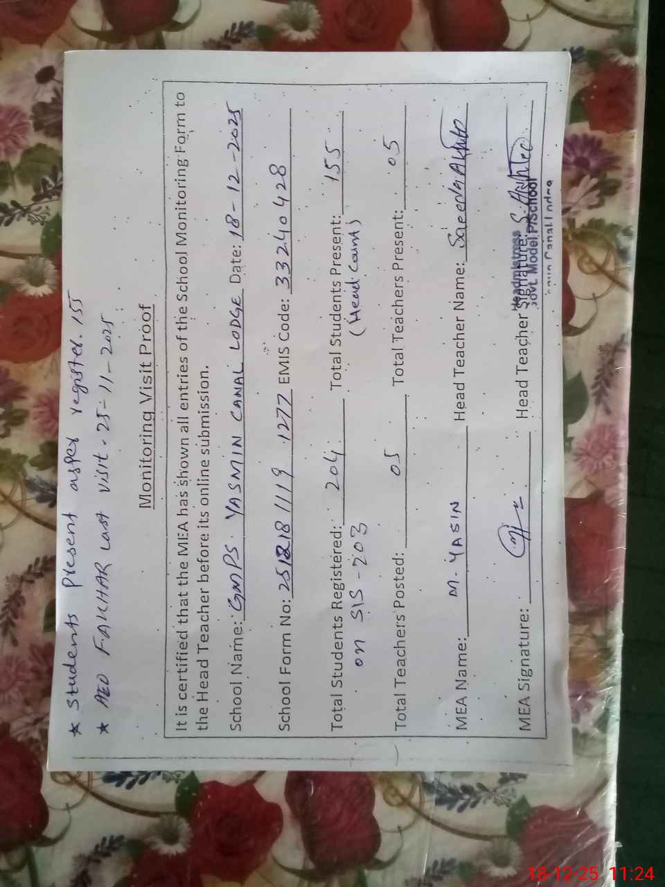 | Attendance Register | Head Teacher | MEA with School | Visit Proof |