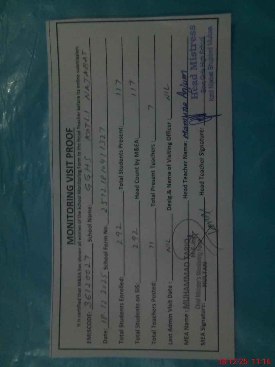 | Attendance Register | Head Teacher | MEA with School | Visit Proof |