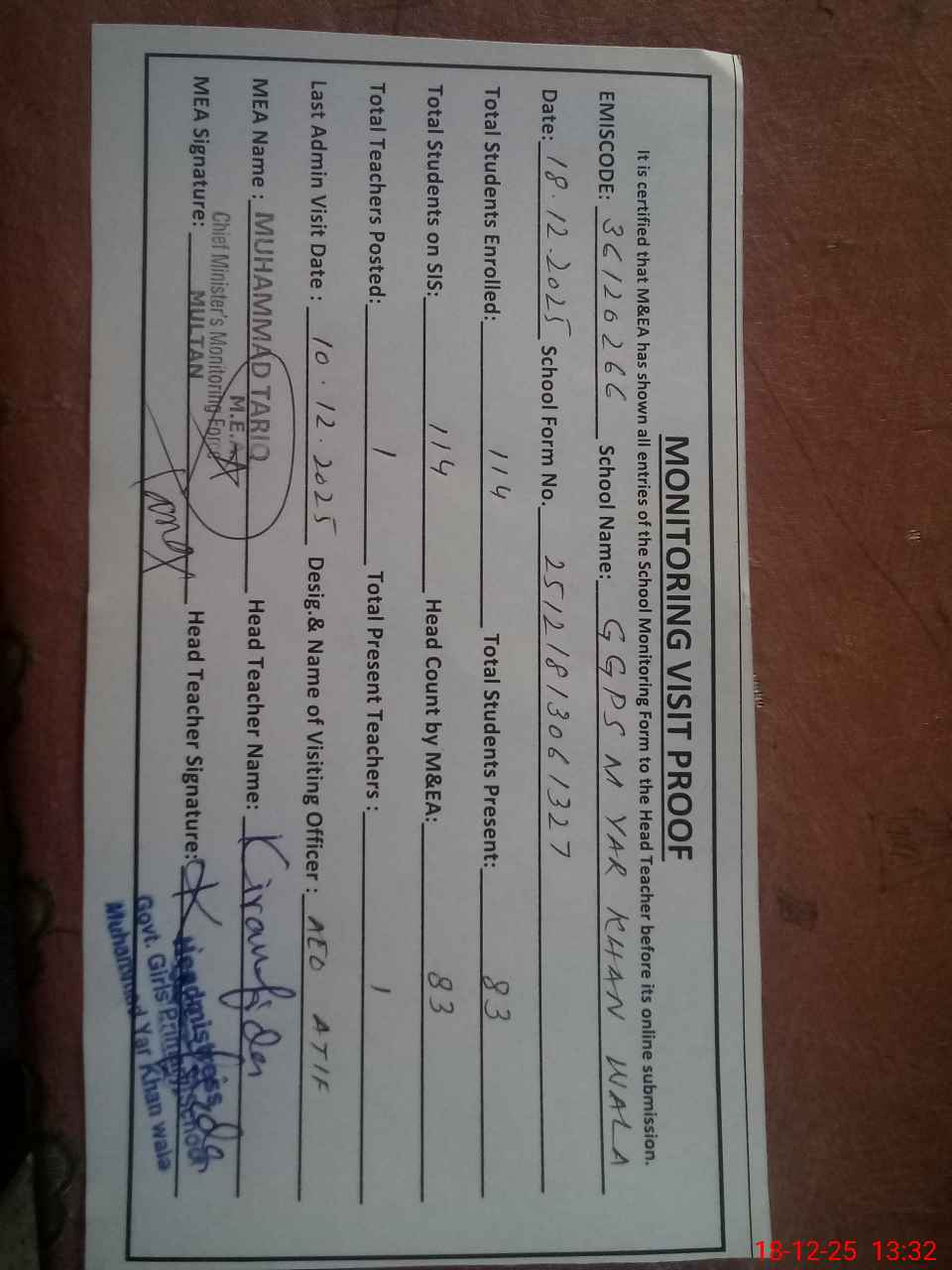| EMIS Code: 36120266 | Name of School: GGPS MUHAMAD YAR KHAN WALA SHUJABAD | |||