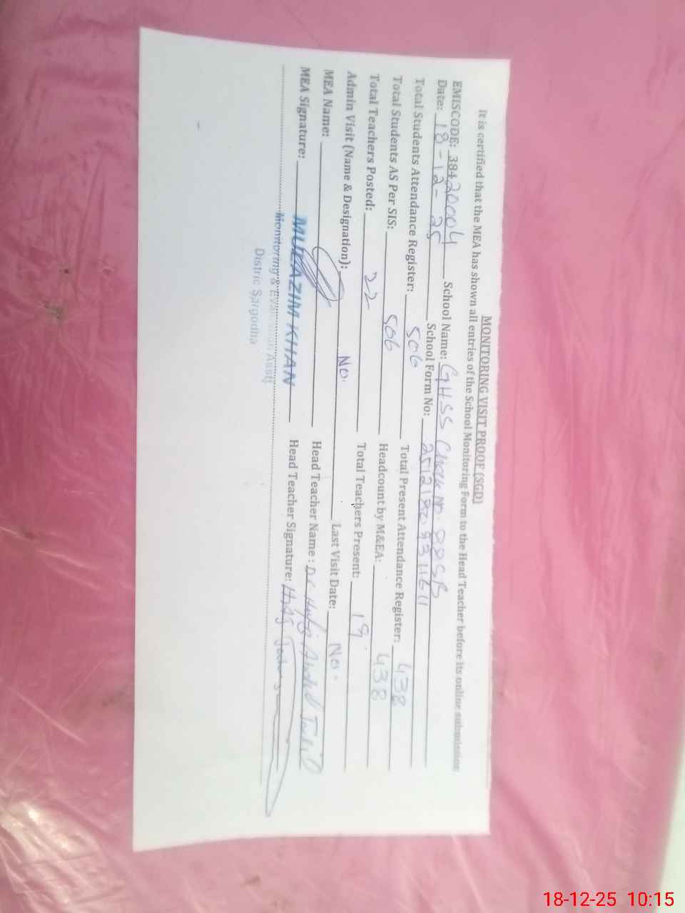 | Attendance Register | Head Teacher | MEA with School | Visit Proof |