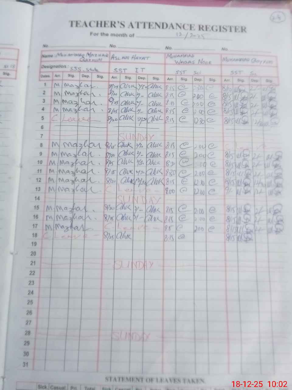 | CNIC | Full Name | Designation | R/C | Absence During Last Calender Month |