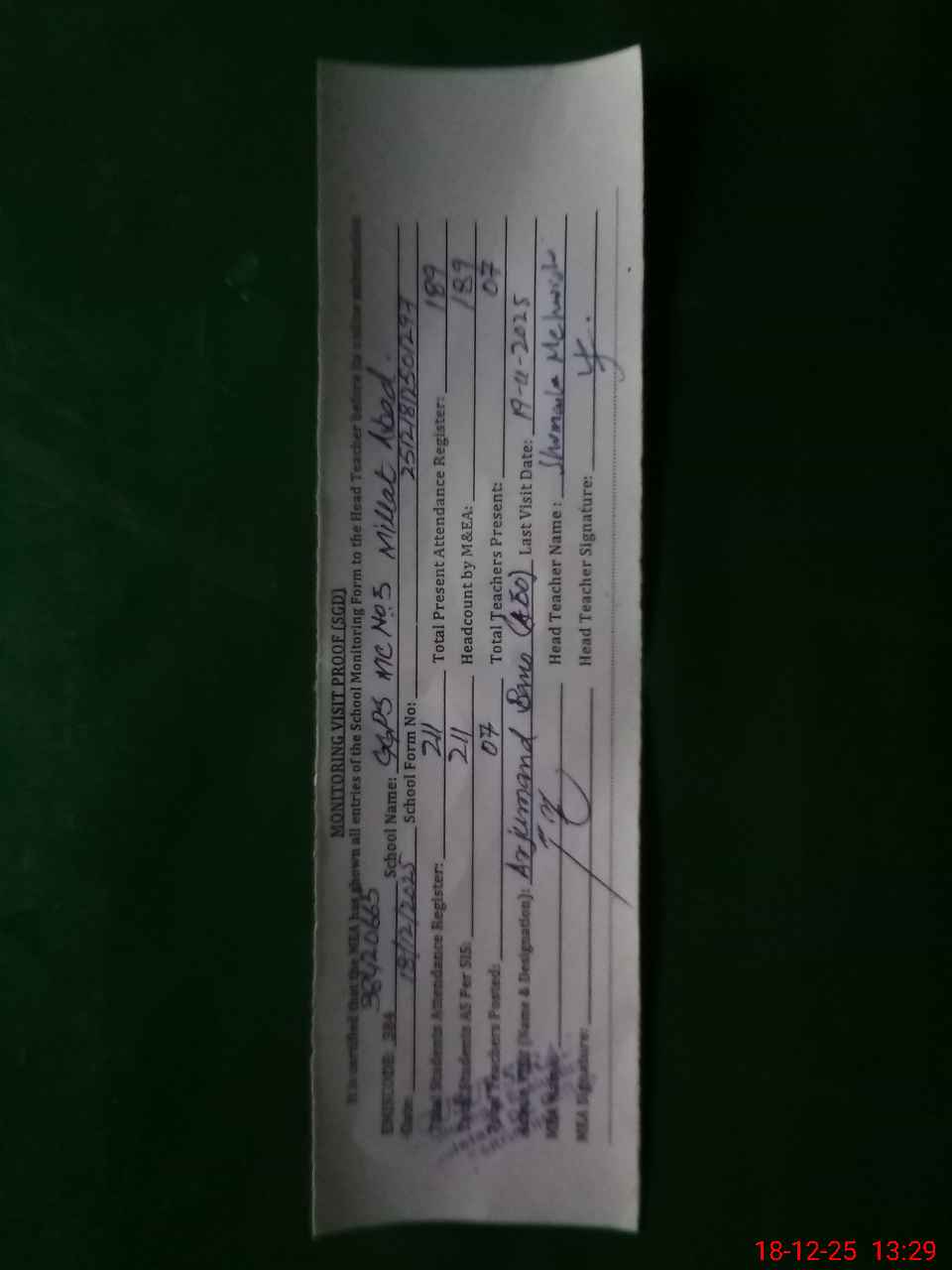 | Attendance Register | Head Teacher | MEA with School | Visit Proof |