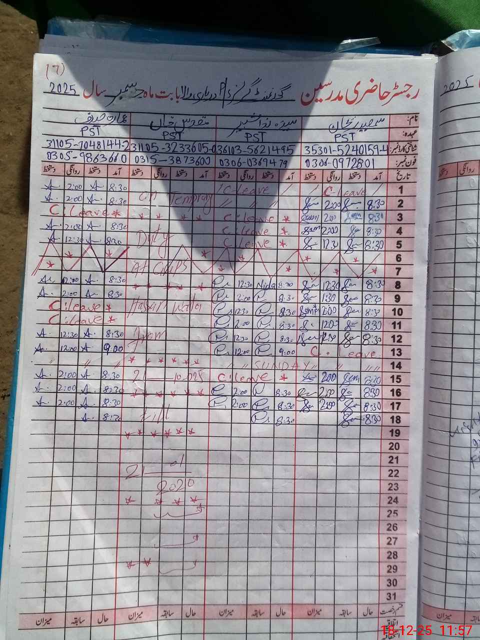 | CNIC | Full Name | Designation | R/C | Absence during last cal. month |