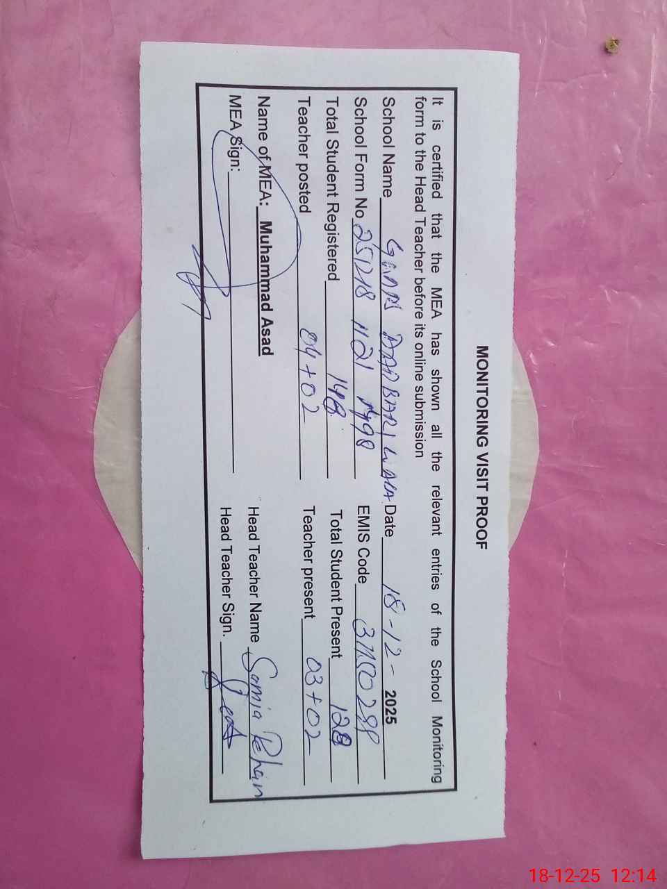 | Attendance Register | Head Teacher | MEA with School | Visit Proof |