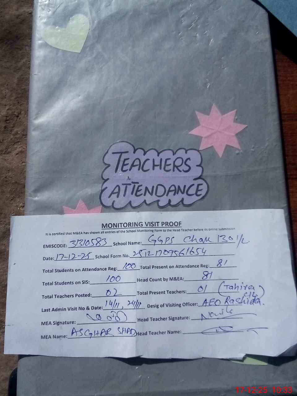 | Attendance Register | Head Teacher | MEA with School | Visit Proof |