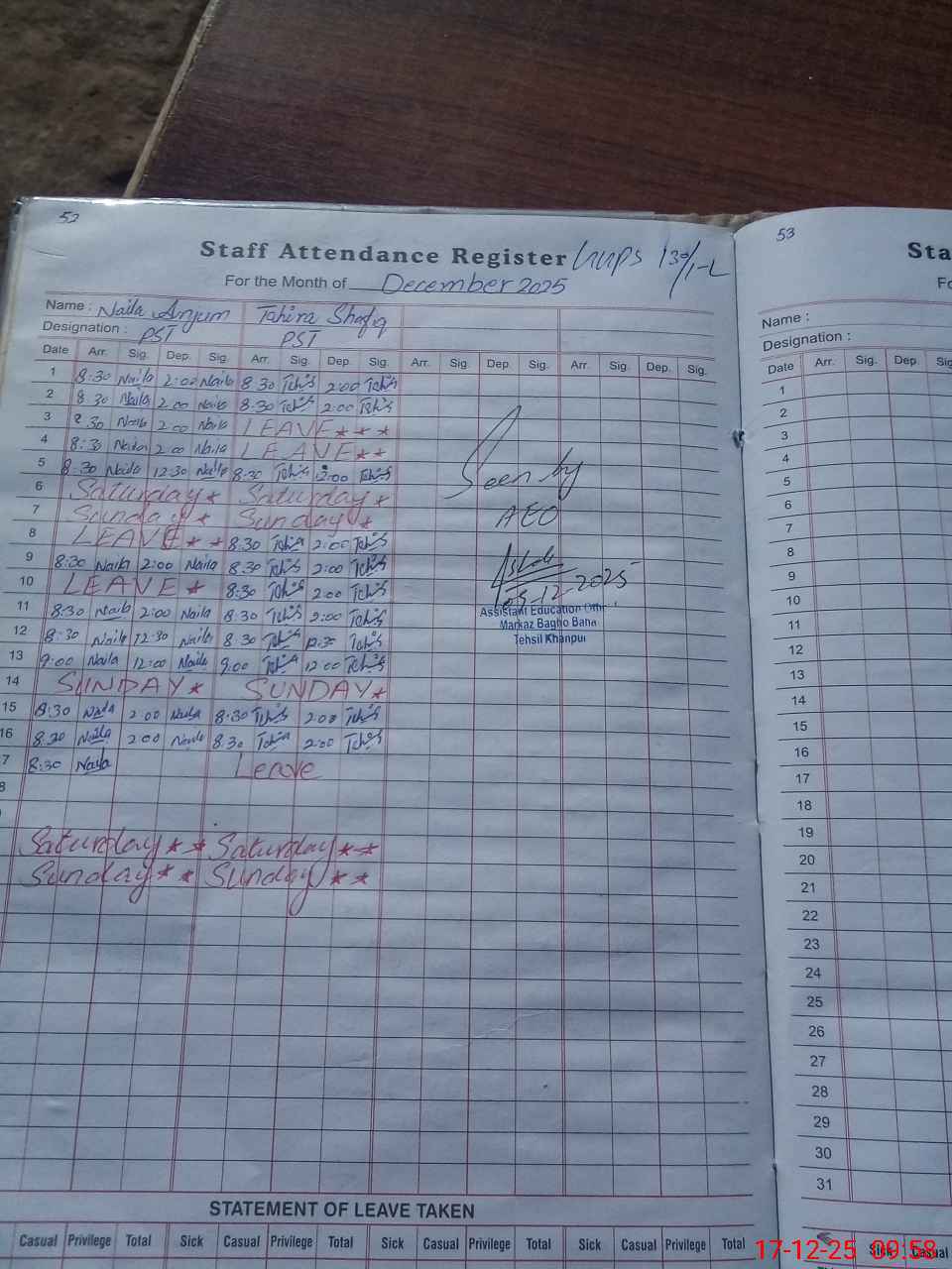 | CNIC | Full Name | Designation | R/C | Absence During Last Calender Month |