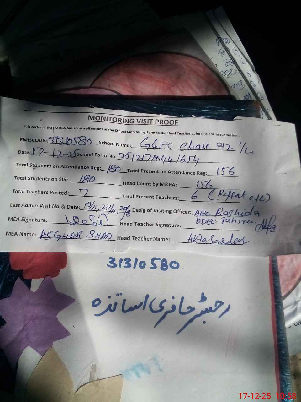 | Attendance Register | Head Teacher | MEA with School | Visit Proof |
