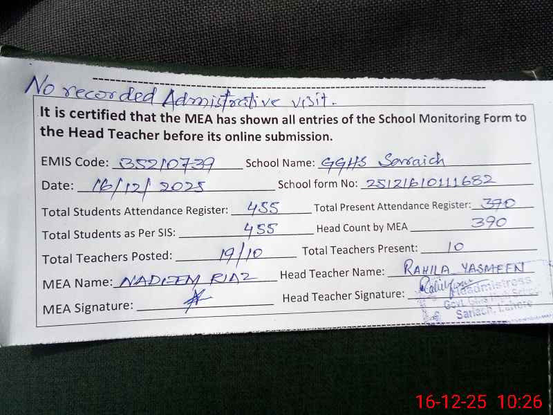 | Certified that this School was Inspected by the Undersigned MEA/DMO Today and the Information Stated Above is as Per Record. | |||||