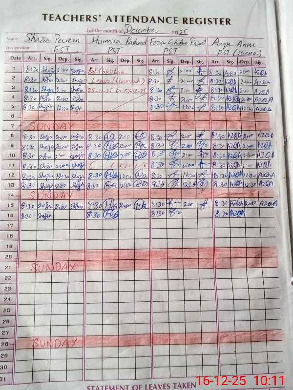 | CNIC | Full Name | Designation | R/C | Absence During Last Calender Month |