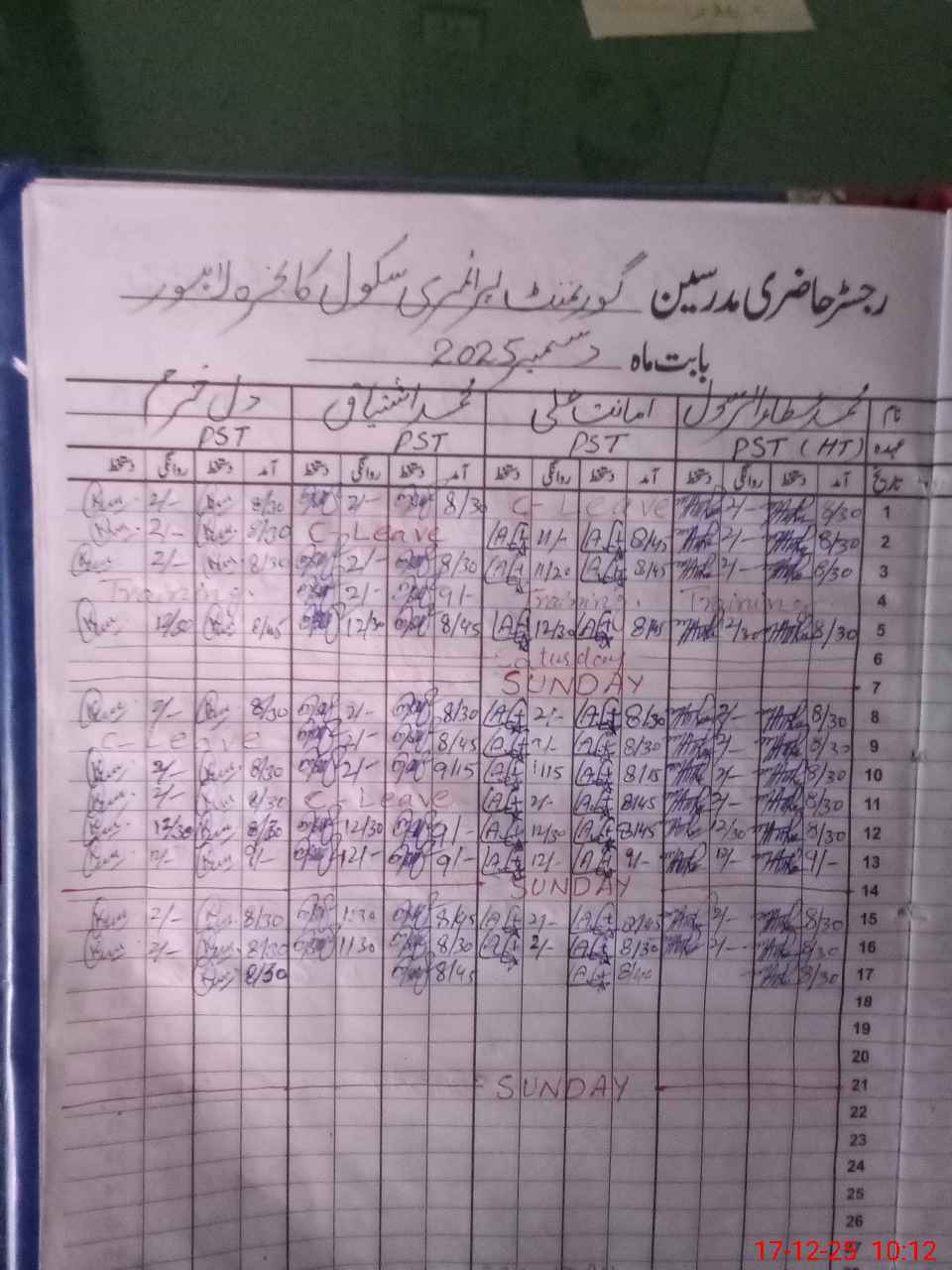 | CNIC | Full Name | Designation | R/C | Absence During Last Calender Month |