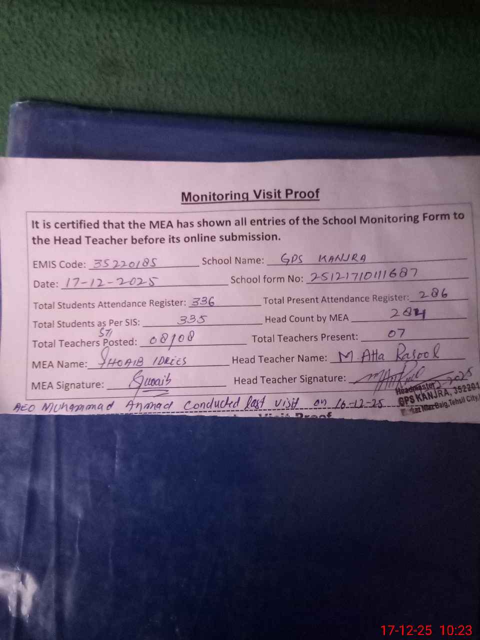 | Attendance Register | Head Teacher | MEA with School | Visit Proof |