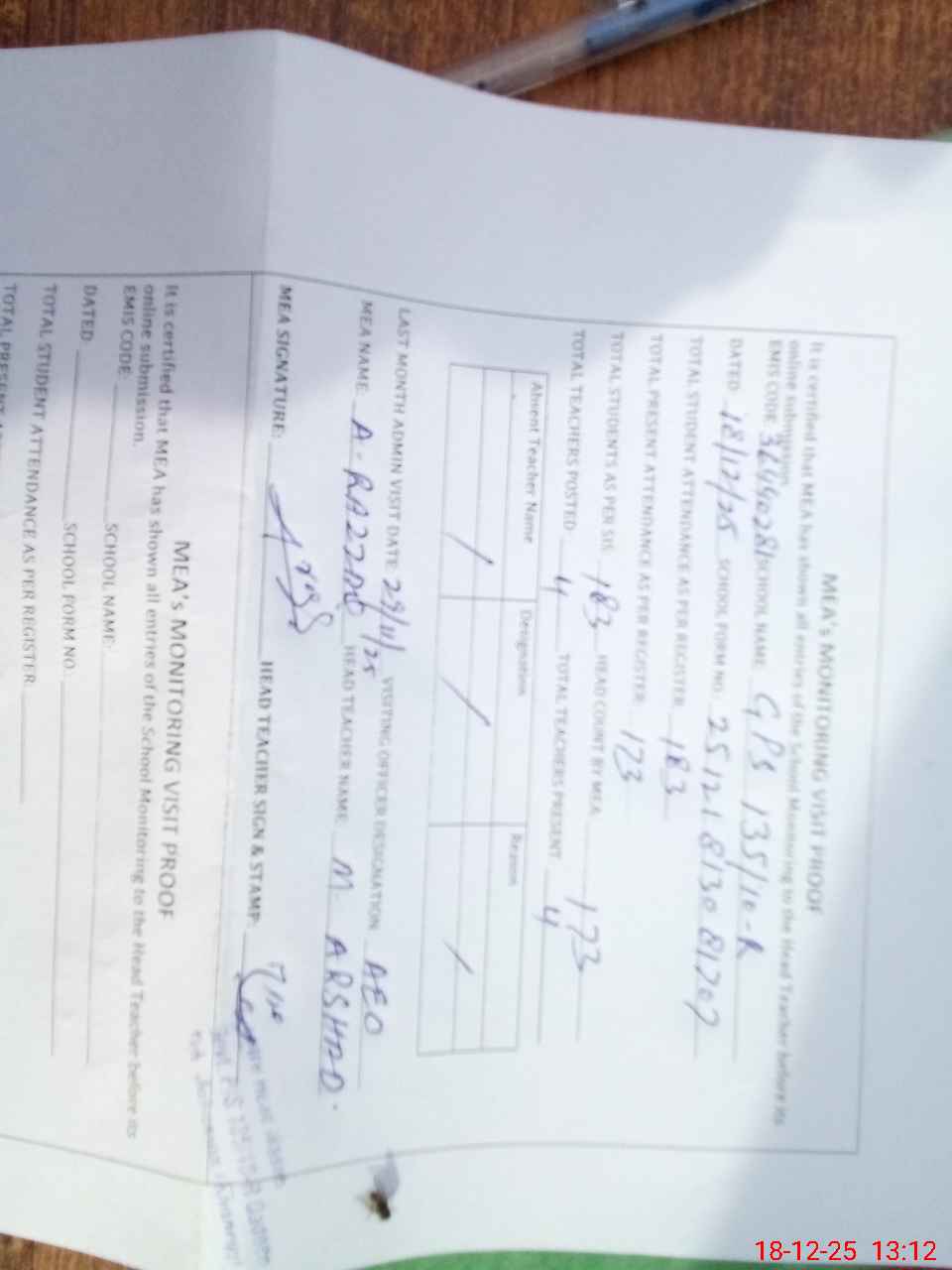 | Attendance Register | Head Teacher | MEA with School | Visit Proof |