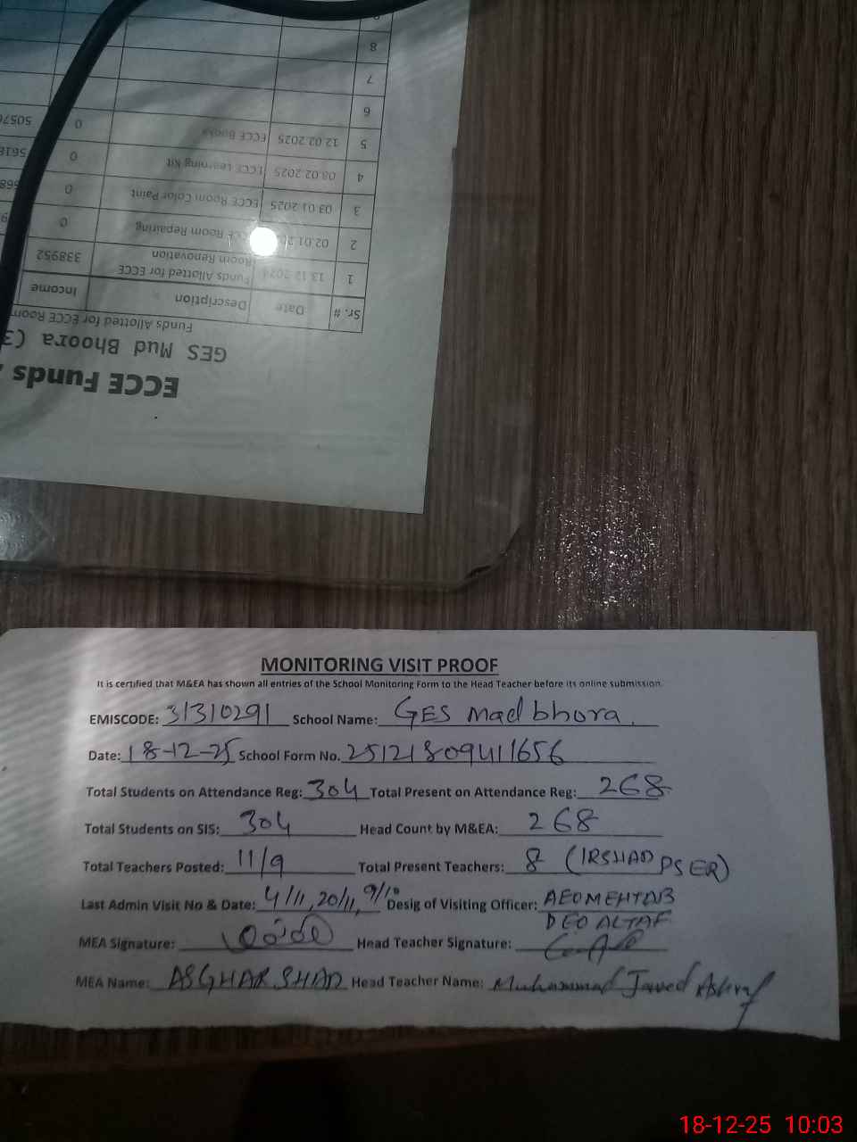 | EMIS Code: 31310291 | Name of School: GES MUD BHOORA | |||