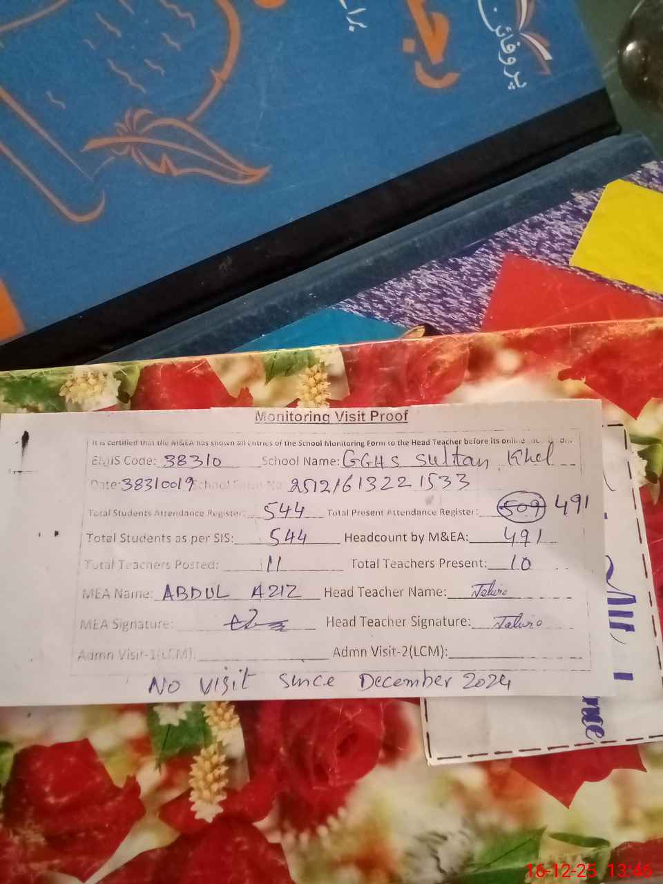 | EMIS Code: 38310019 | Name of School: GGHS SULTAN KHEL | |||
