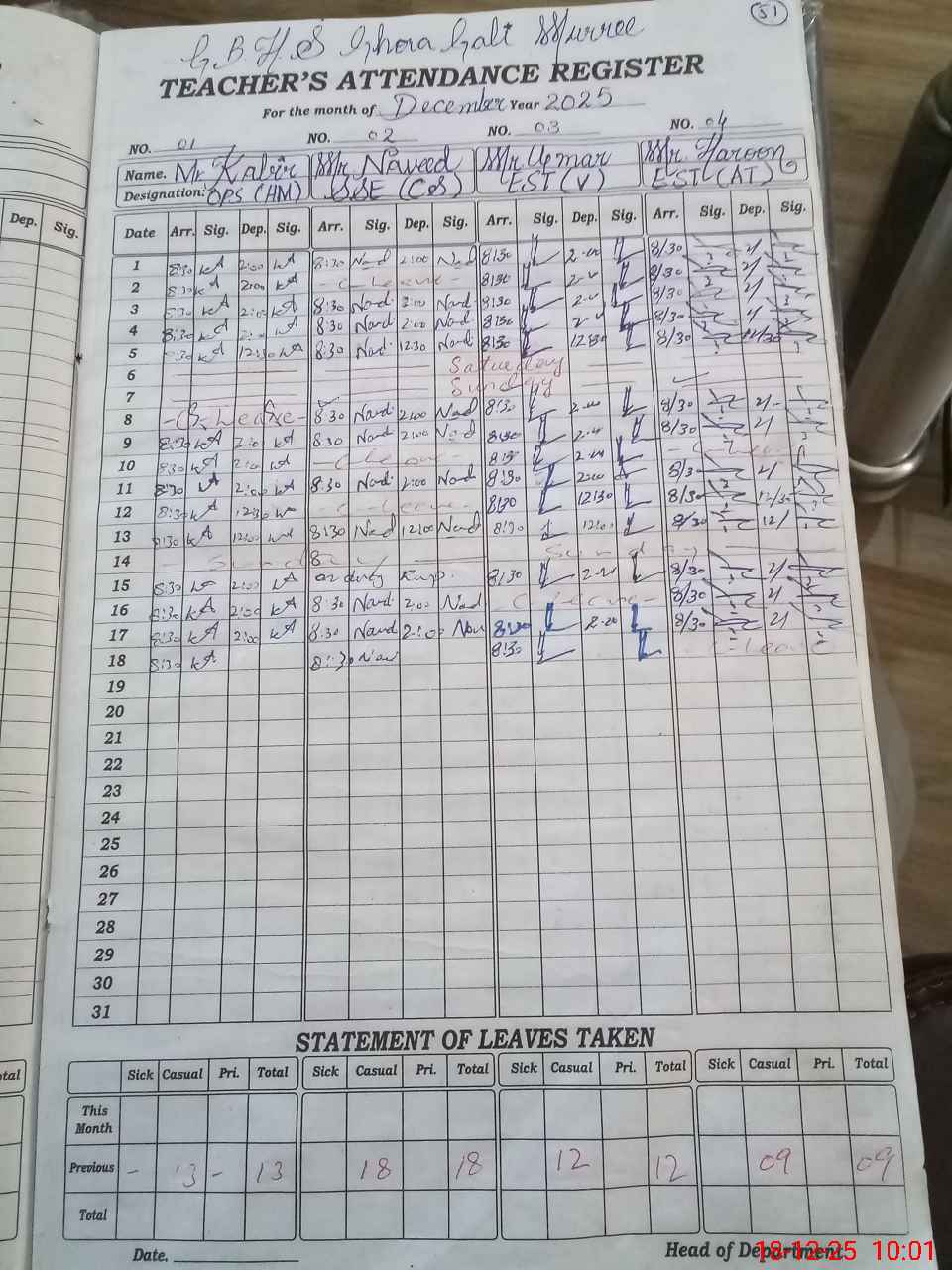 | Leave | Duty | Absent | Maternity | Medical | Ex- Pak |