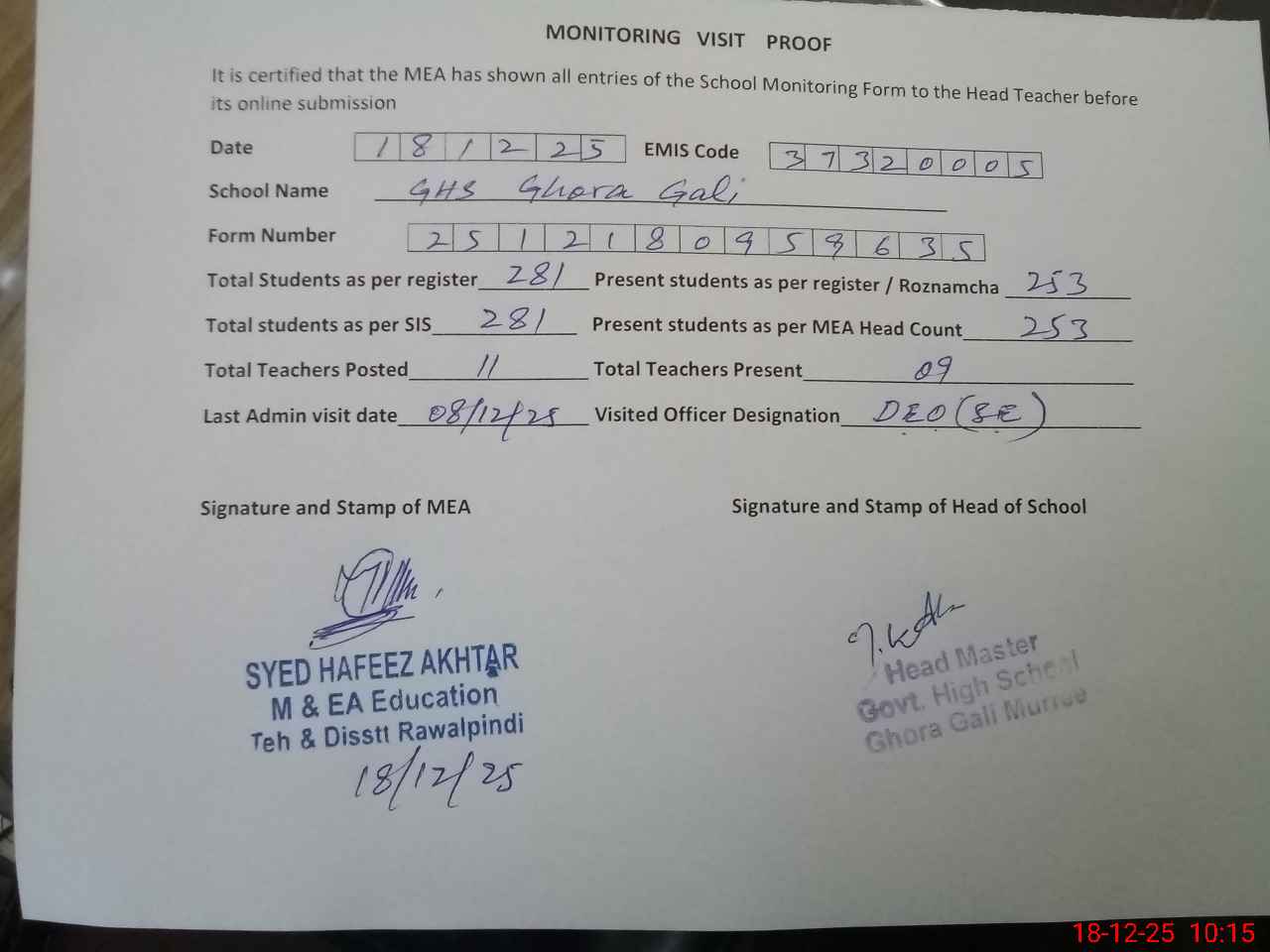 | Certified that this School was Inspected by the Undersigned MEA/DMO Today and the Information Stated Above is as Per Record. | |||||
