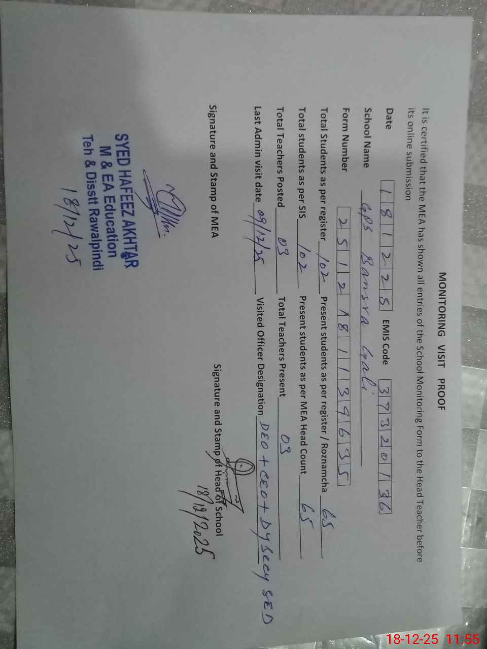 | Certified that this School was Inspected by the Undersigned MEA/DMO Today and the Information Stated Above is as Per Record. | |||||