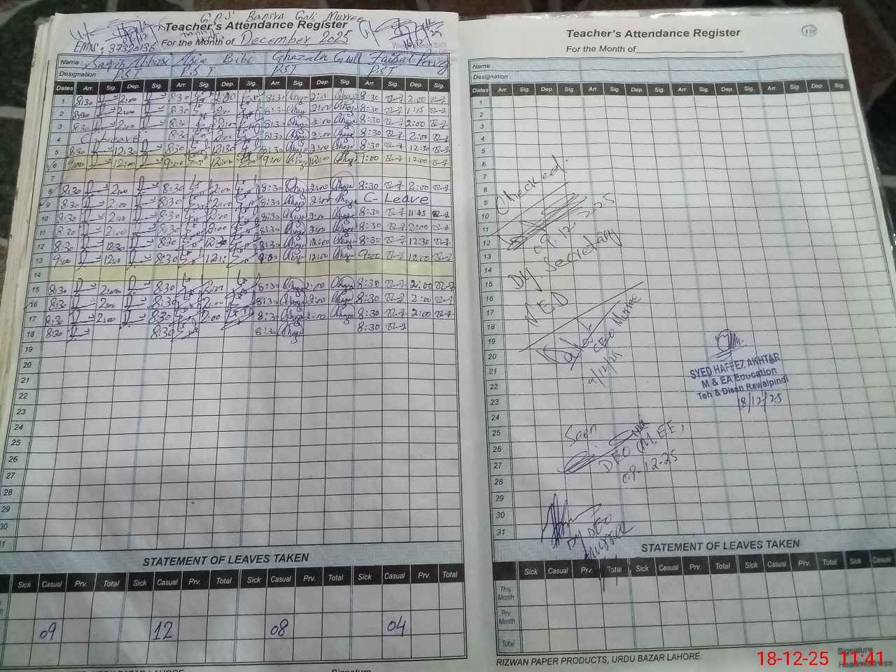 | Remarks (Use Separate Page if Required): Teacher Faisal Pervez PST is temporarily adjusted in and present in school today Classes ECE and Nursery are Exam Off today | |||||
