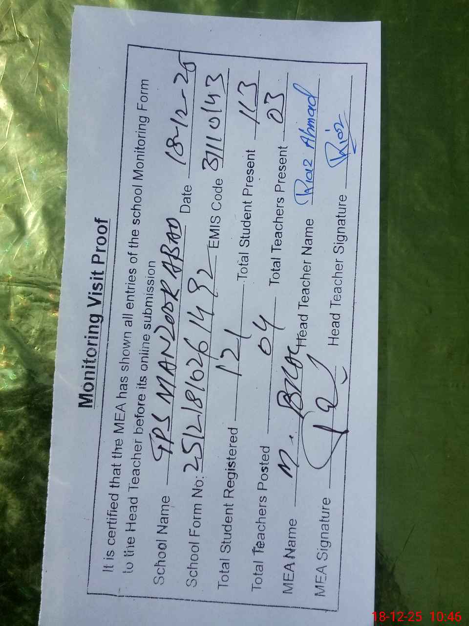 | Attendance Register | Head Teacher | MEA with School | Visit Proof |