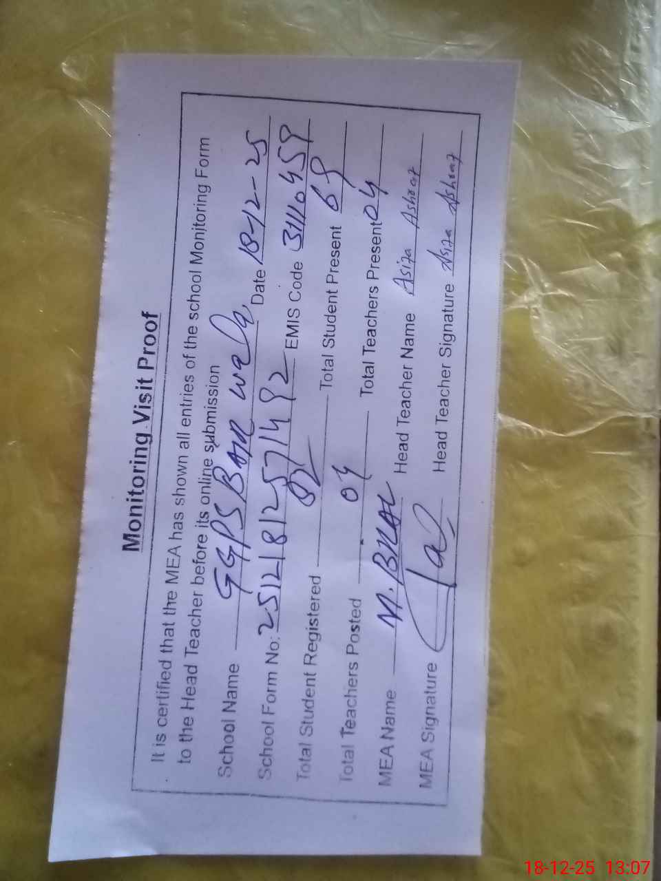 | EMIS Code: 31110459 | Name of School: GGPS BAIR WALA NO.1 | |||