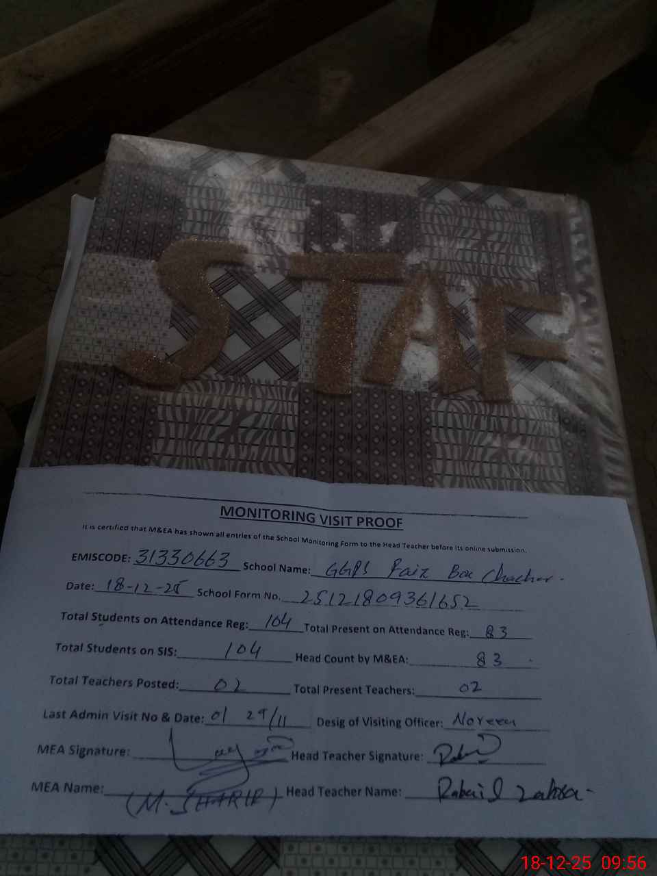 | Attendance Register | Head Teacher | MEA with School | Visit Proof |