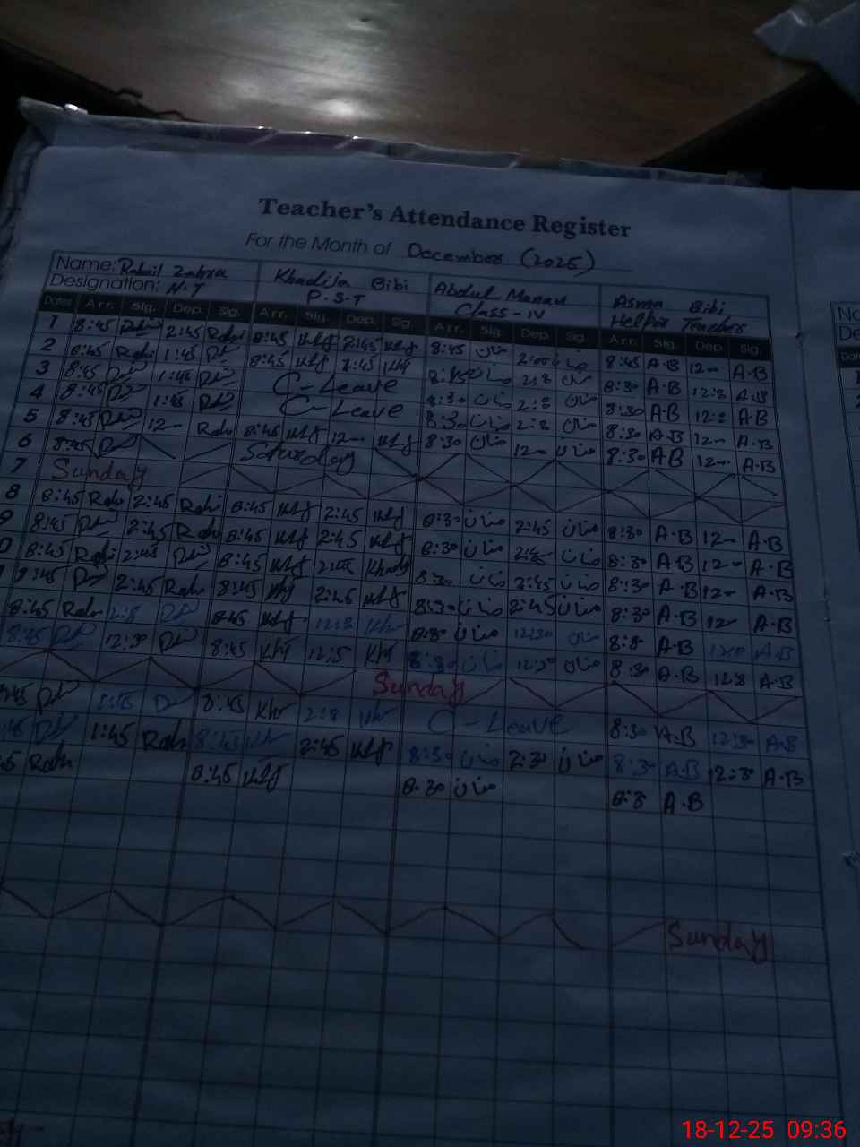 | CNIC | Full Name | Designation | R/C | Absence During Last Calender Month |