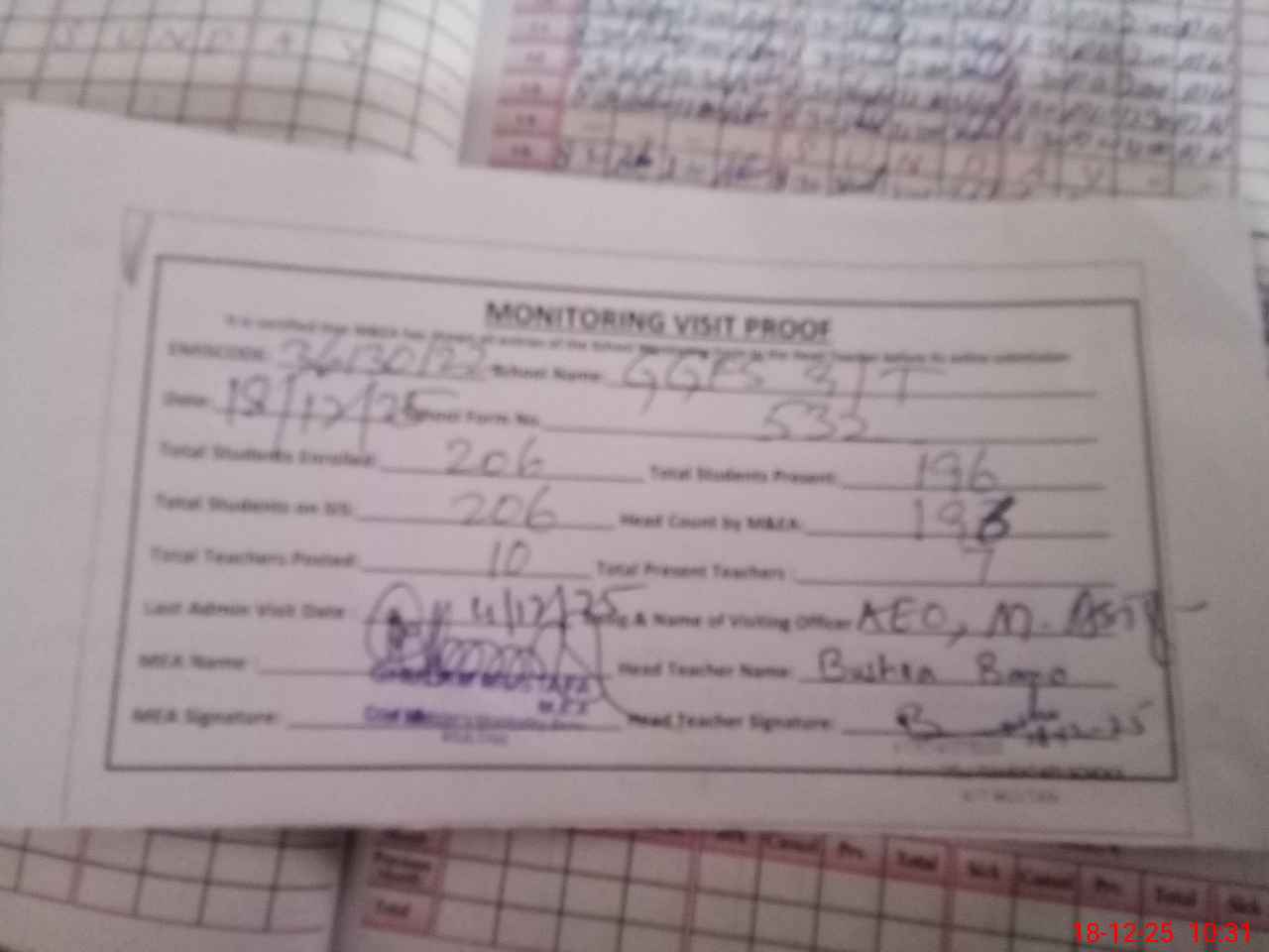 | Attendance Register | Head Teacher | MEA with School | Visit Proof |
