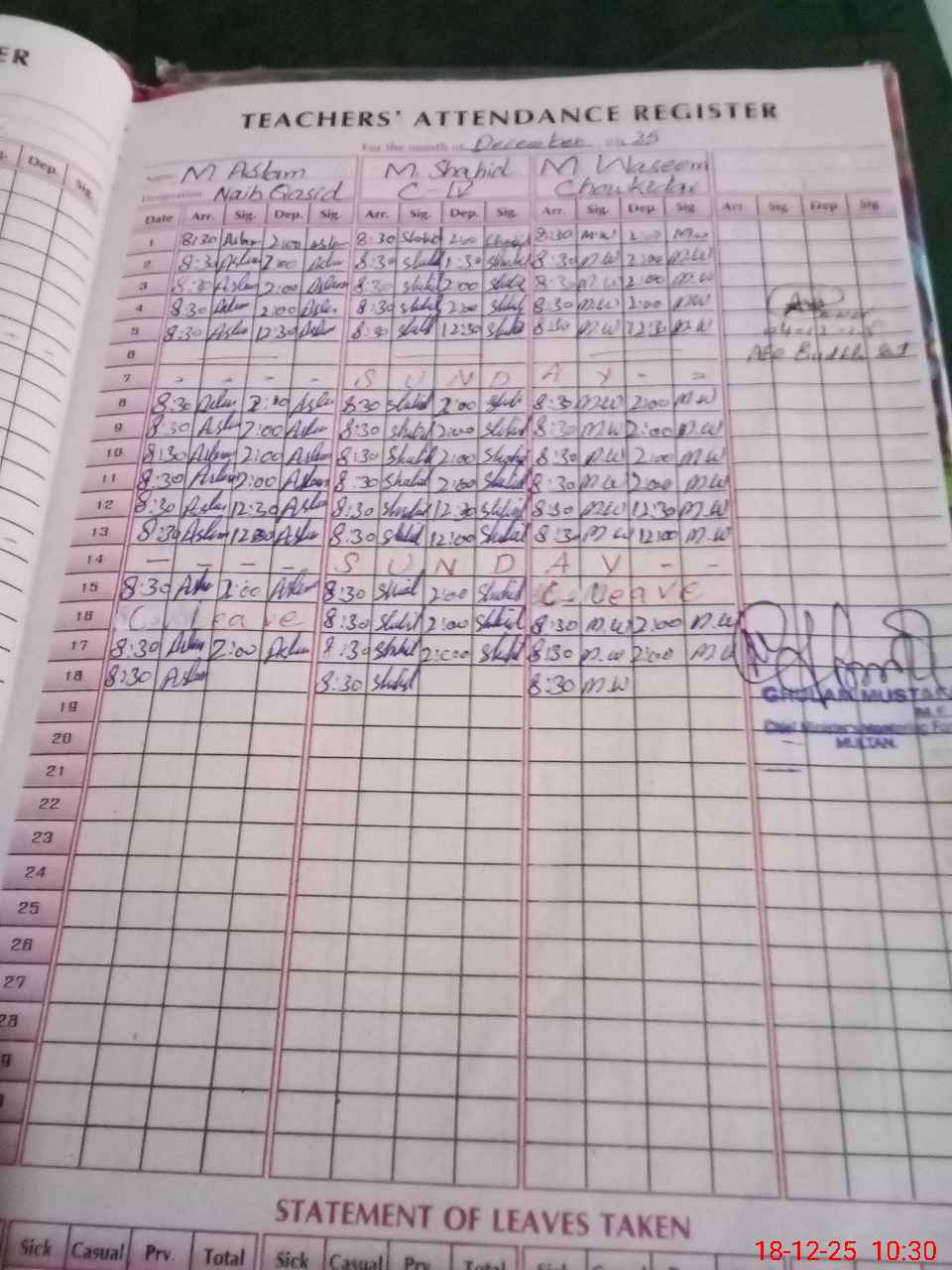 | CNIC | Full Name | Designation | R/C | Absence During Last Calender Month |