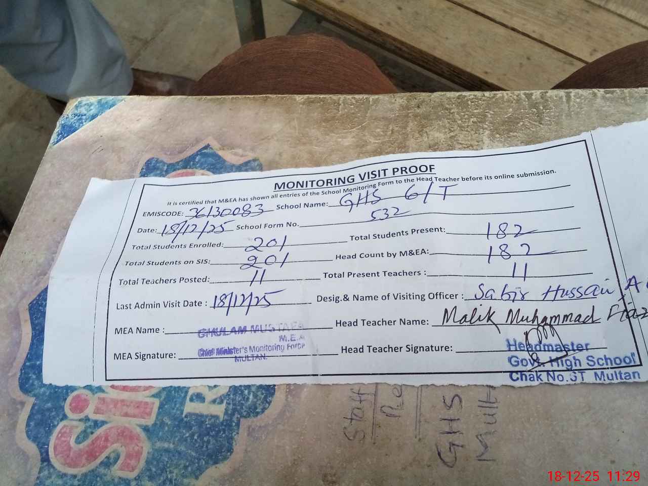 | Attendance Register | Head Teacher | MEA with School | Visit Proof |