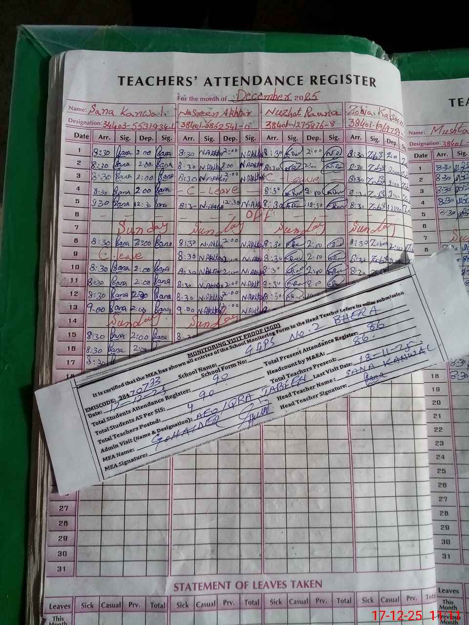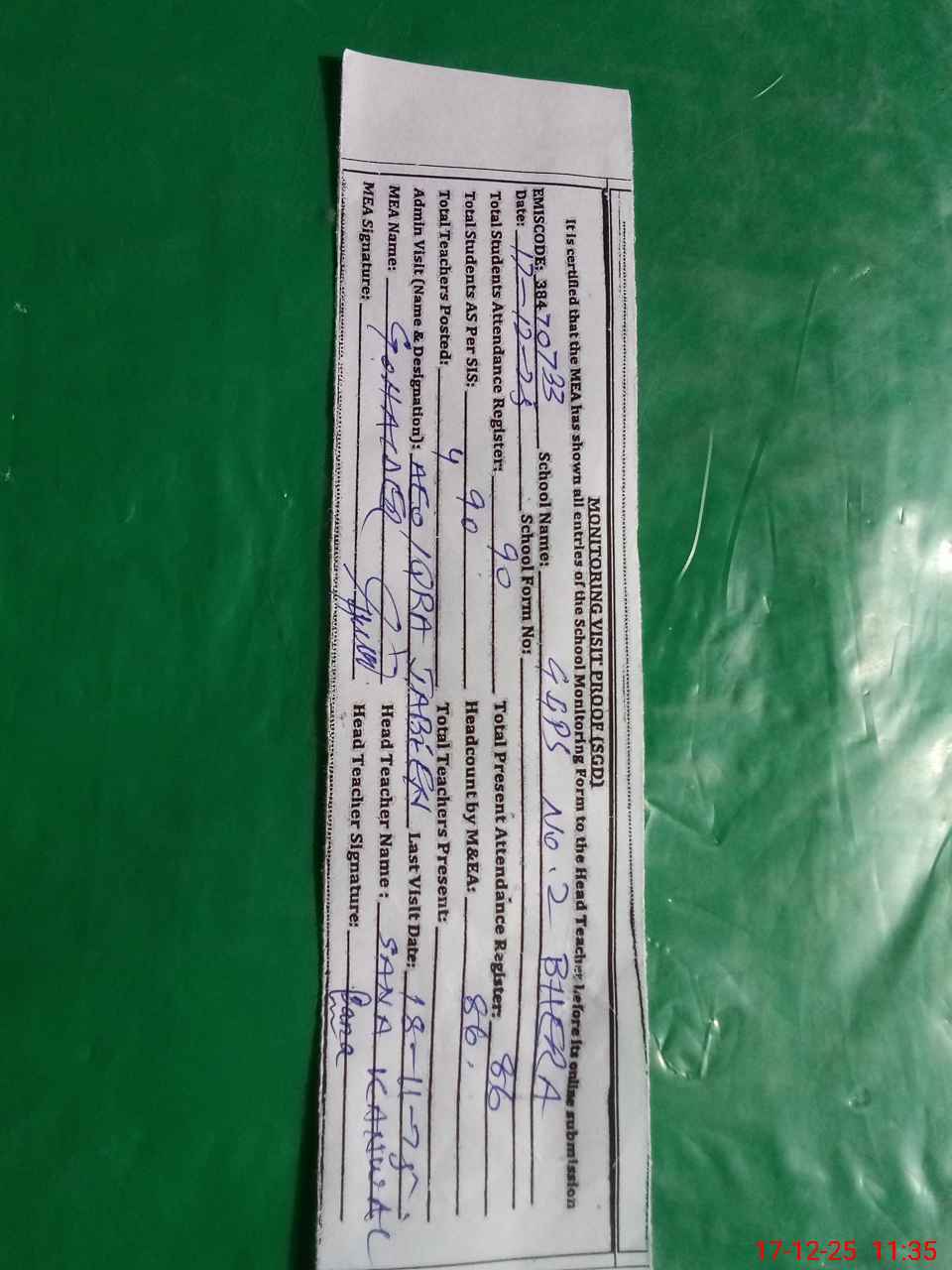 | Attendance Register | Head Teacher | MEA with School | Visit Proof |