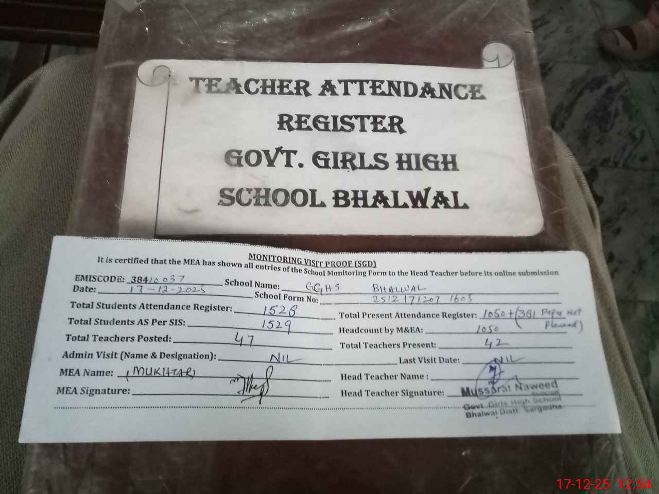| Attendance Register | Head Teacher | MEA with School | Visit Proof |
