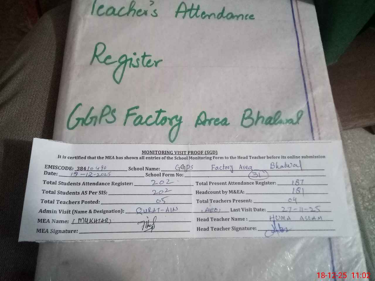 | EMIS Code: 38410490 | Name of School: GGPS FACTORY AREA BHALWAL | |||