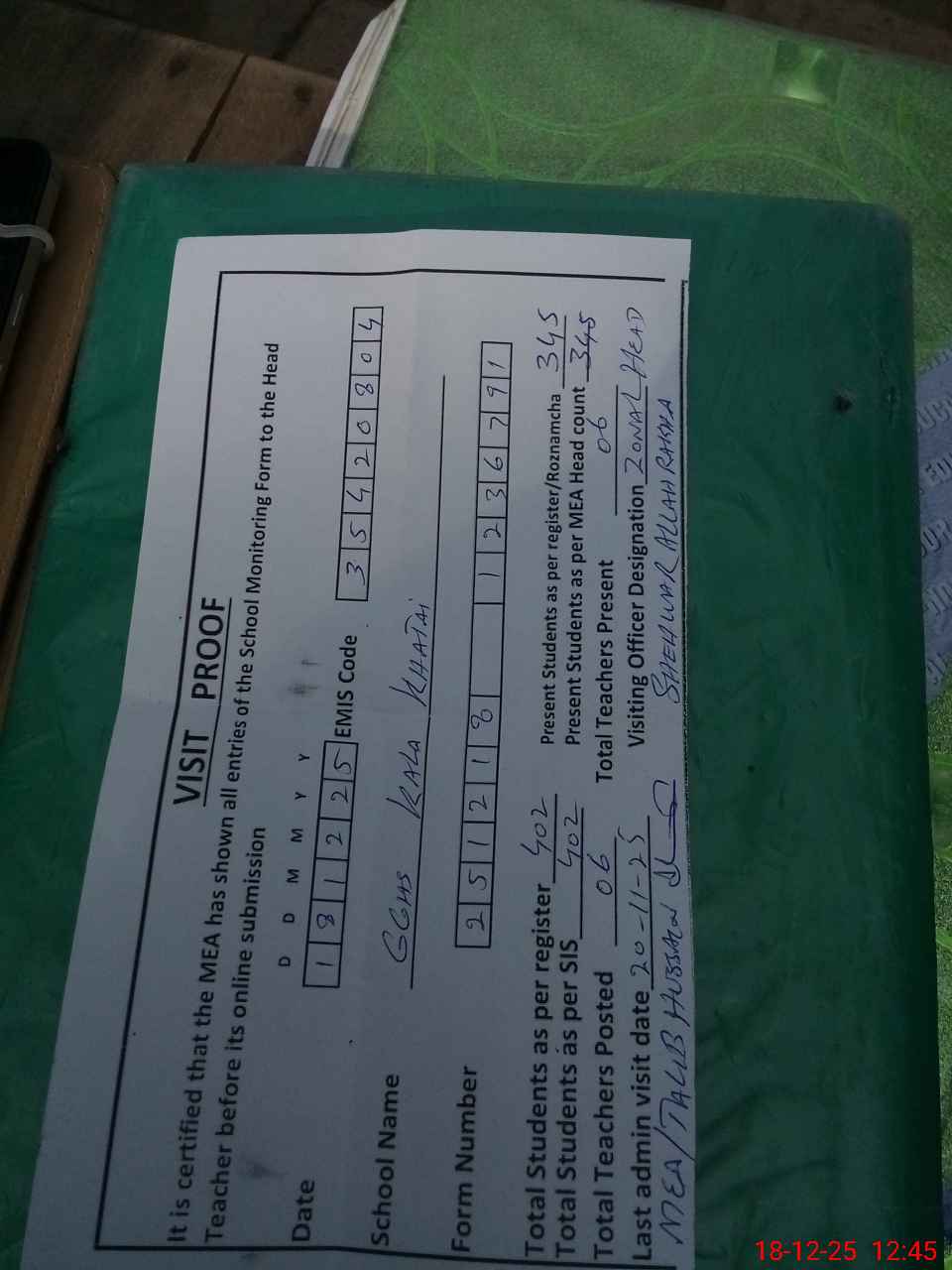 | Attendance Register | Head Teacher | MEA with School | Visit Proof |