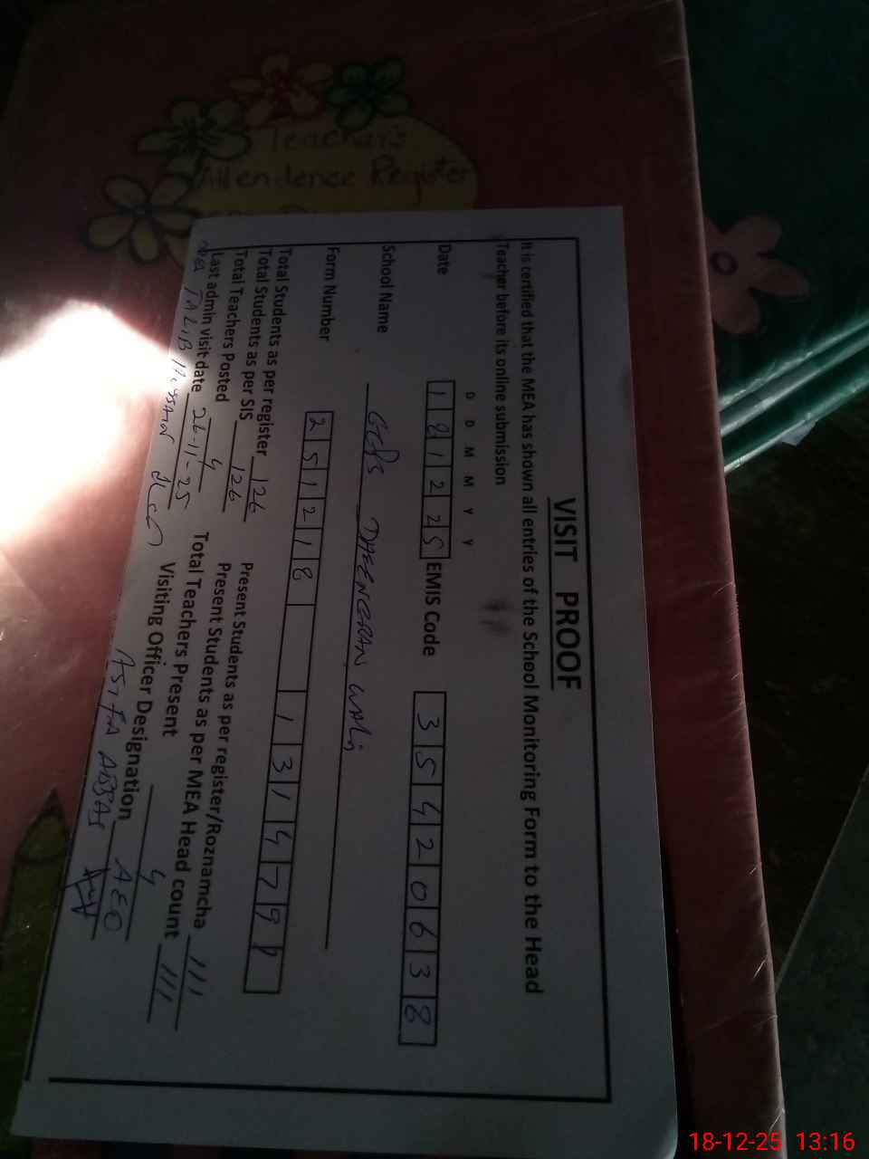 | Attendance Register | Head Teacher | MEA with School | Visit Proof |
